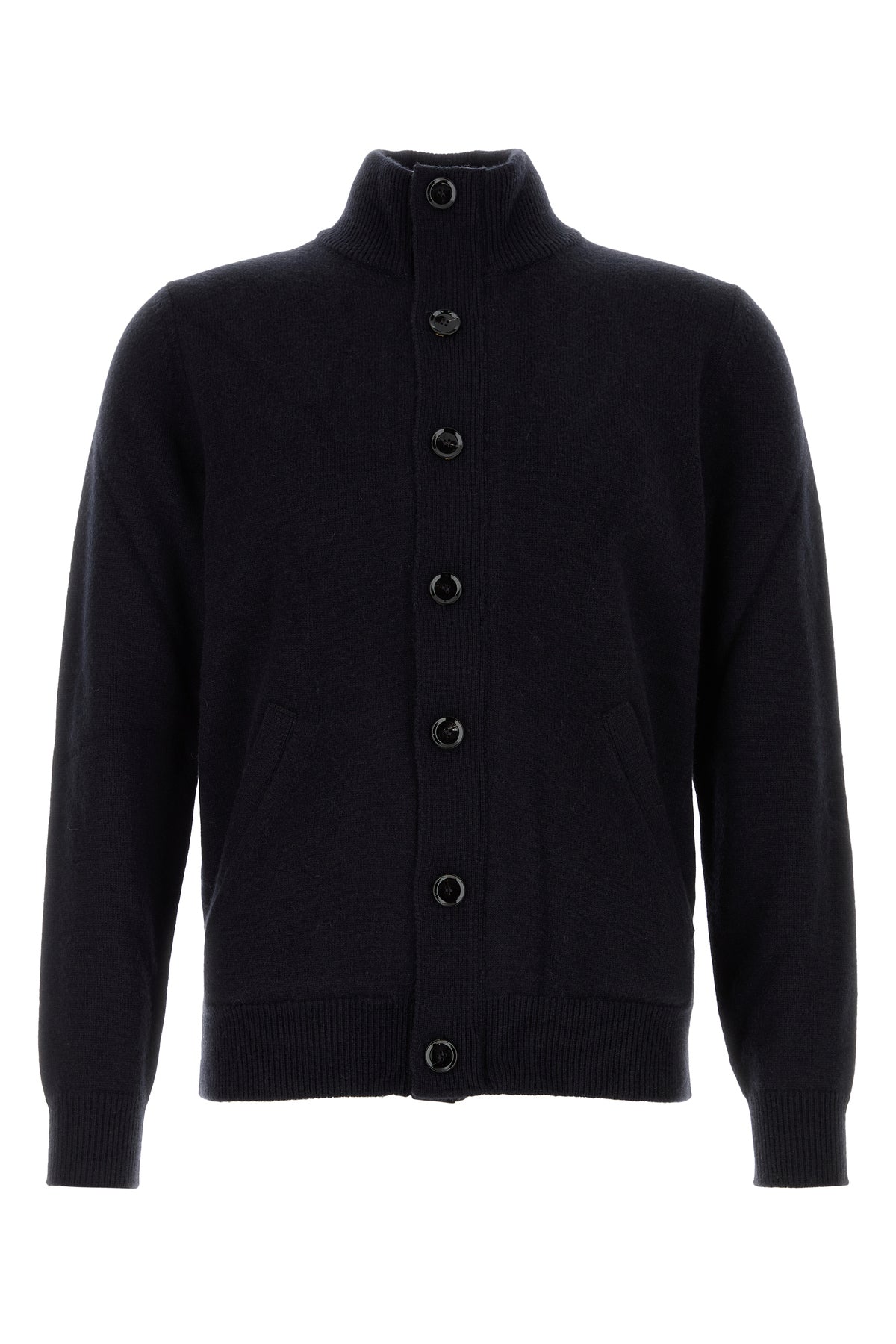 Cardigan realized in pur caserme characterized by high collar.