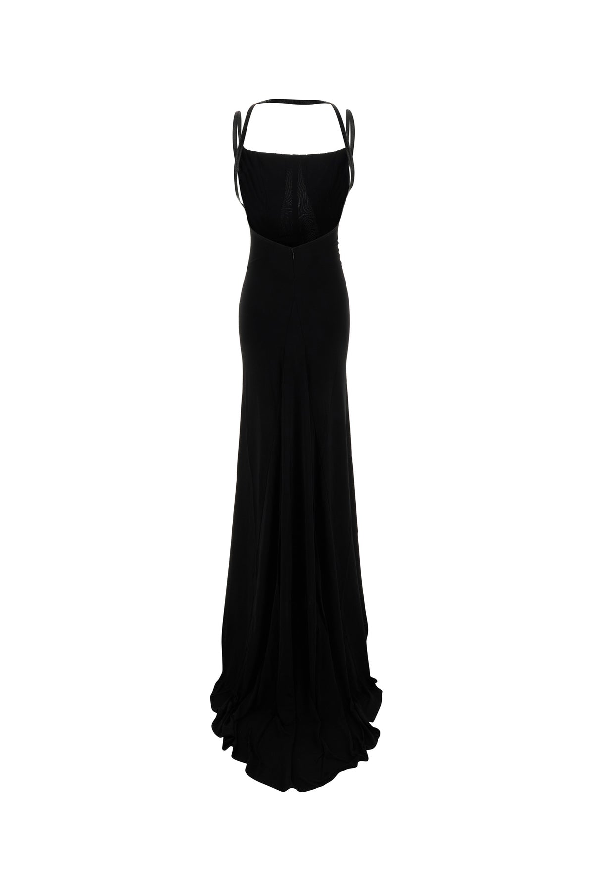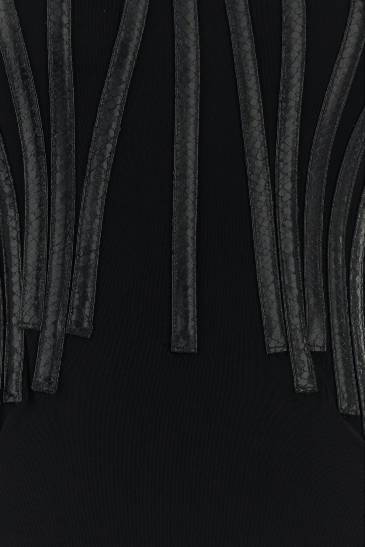 Long dress realized in viscose crepe enriched by crocodile-motif embossed leather inserts at the top.