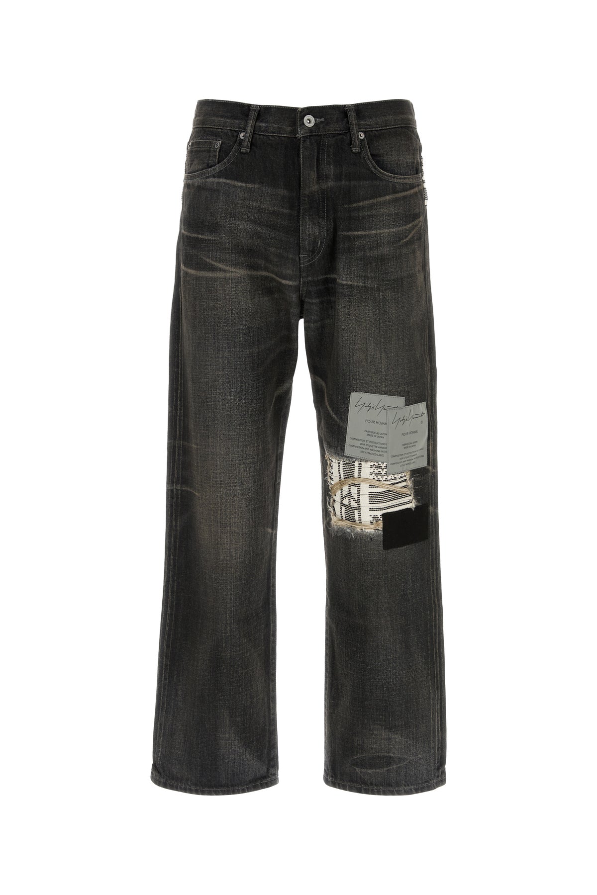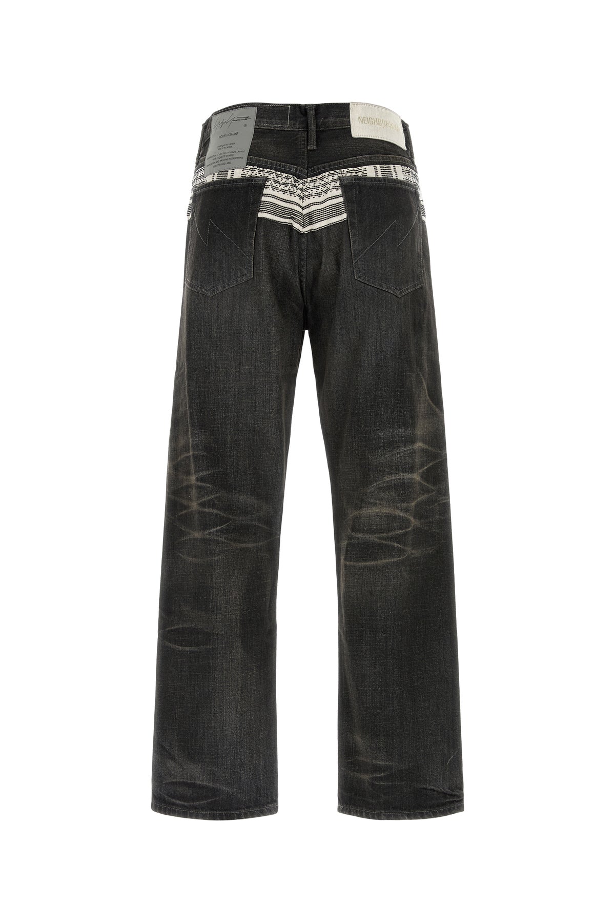 Jeans realized in vintage-effect pure cotton denim enriched by logoed labels and embroidered fabric inserts at the front and at the back.