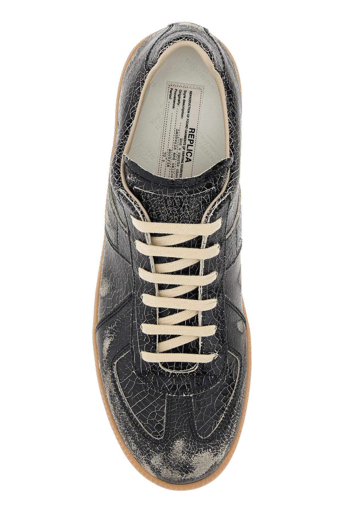 Sneakers realized in craquele effect calf leather characterized by iconic contrasting stitching at the back.