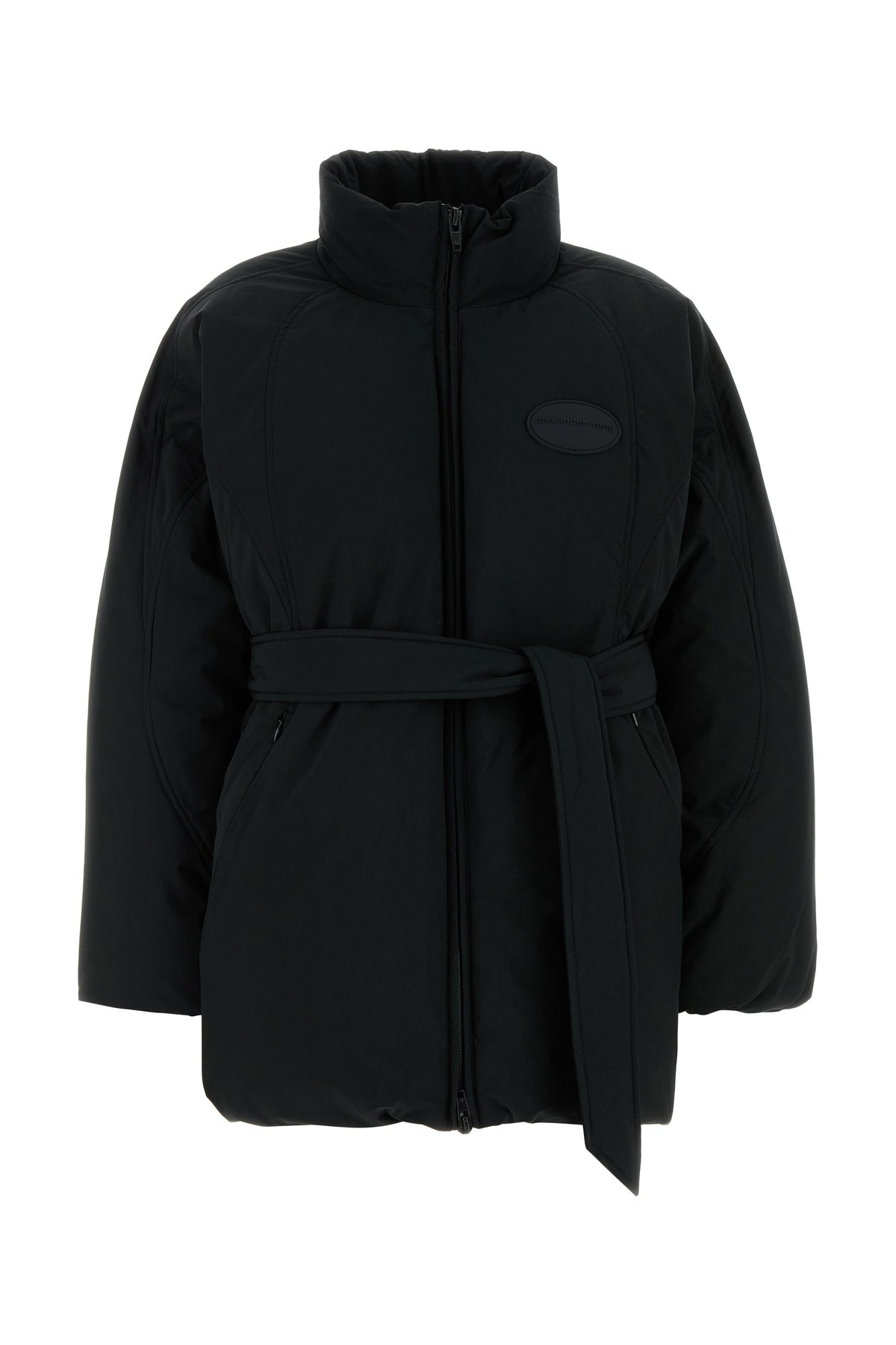 Down jacket realized in polyester blend enriched by rubberized logoed patch on the chest.