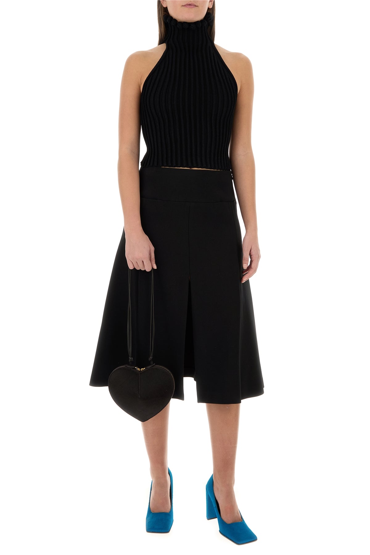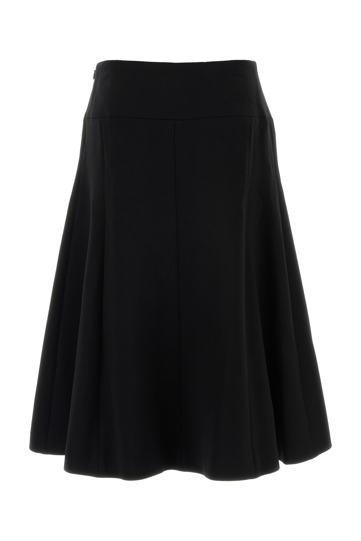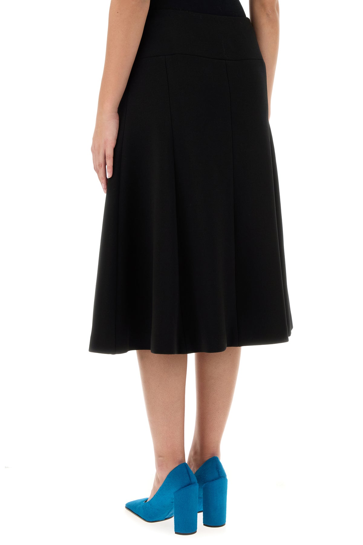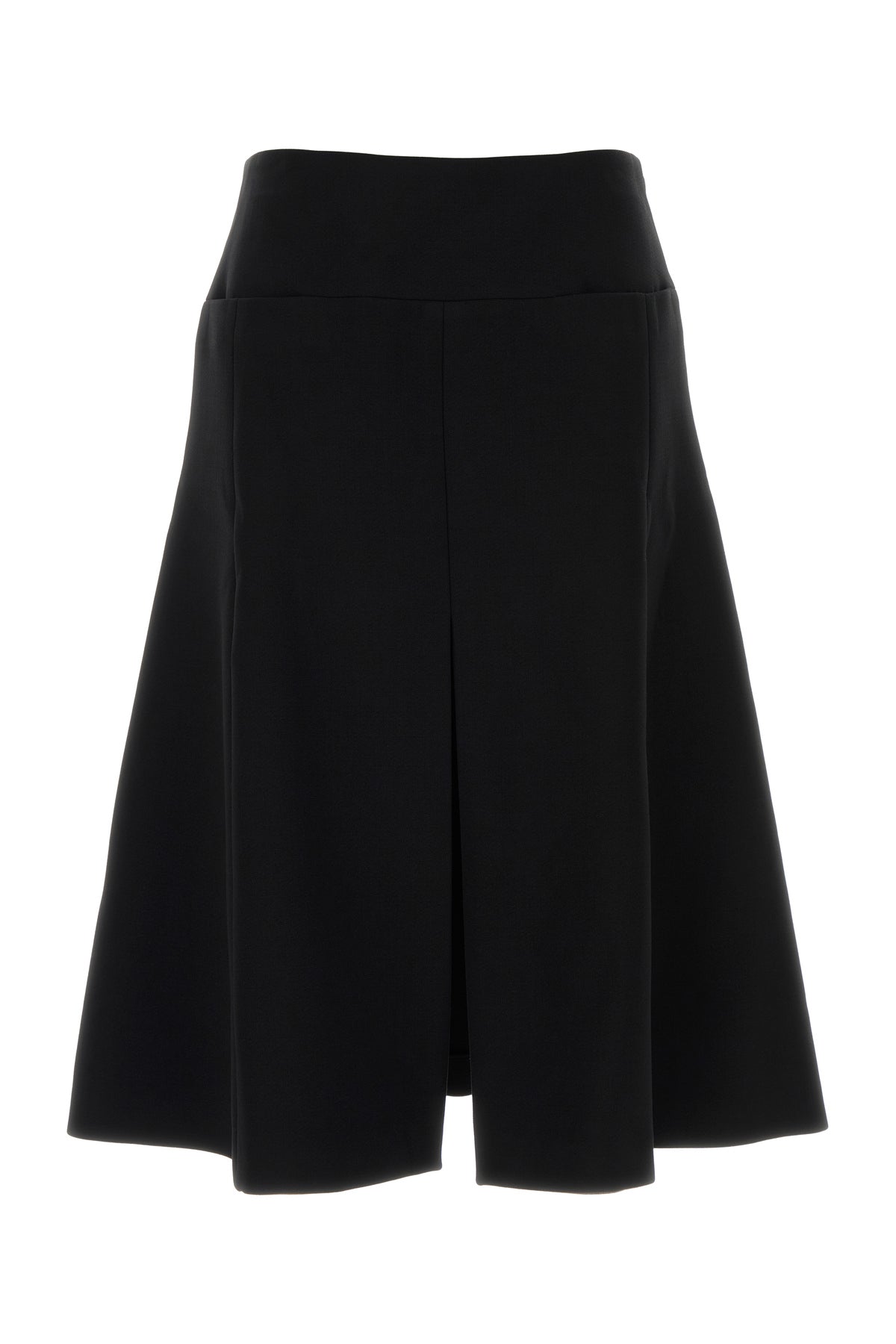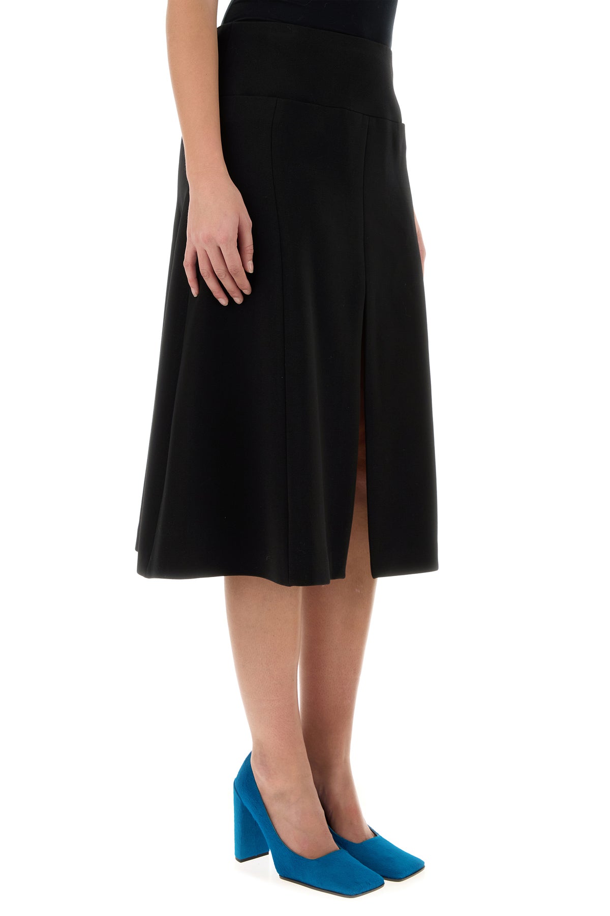 Flared skirt realized in stretch polyester blend characterized by central slit on the hemline.