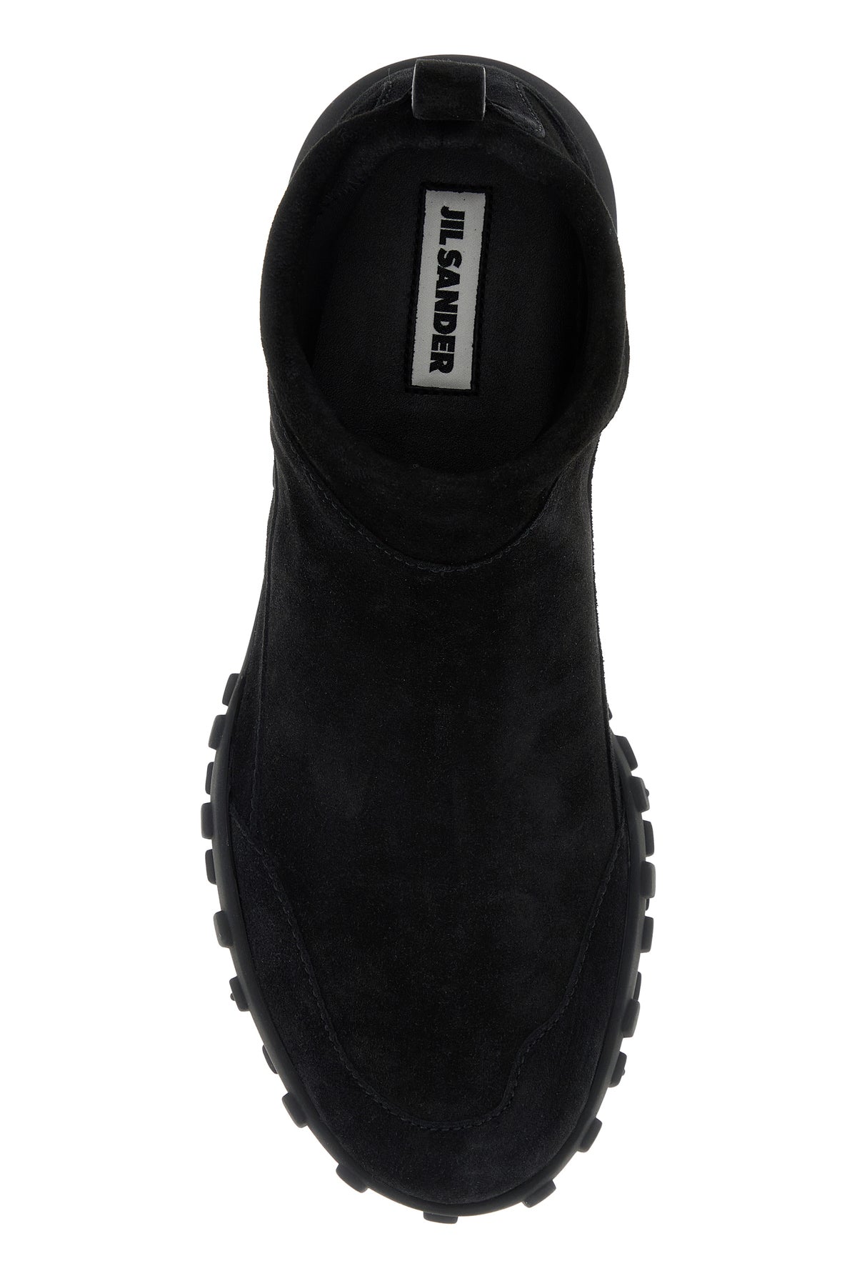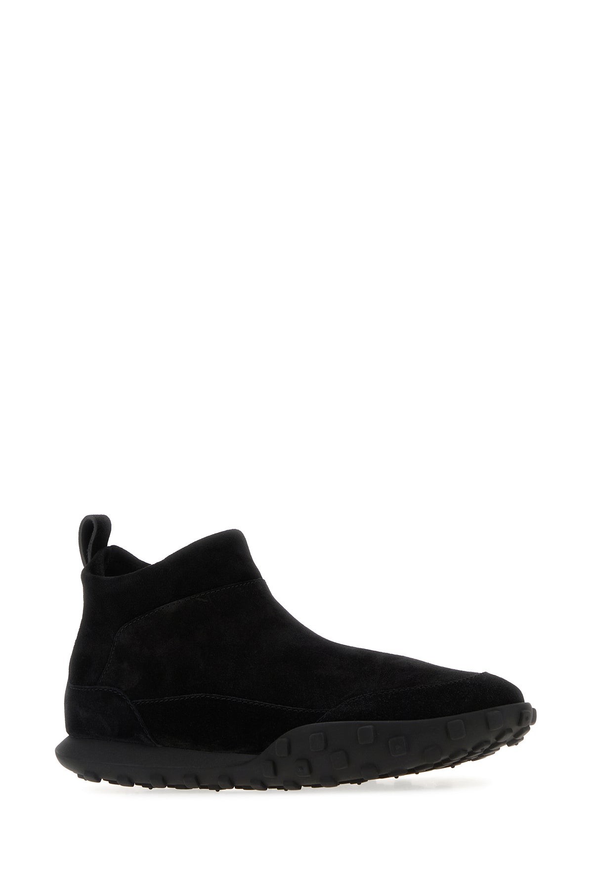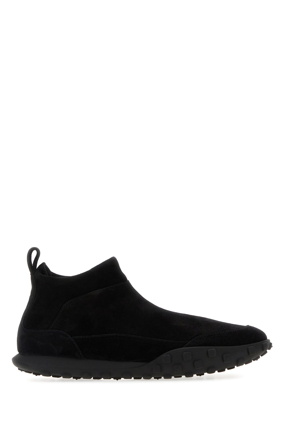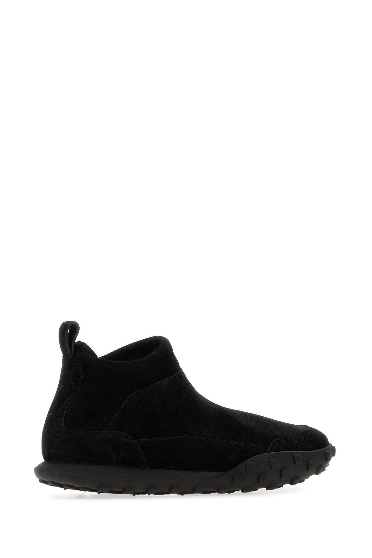 Slip ons realized in suede characterized by embossed logo at the back.
