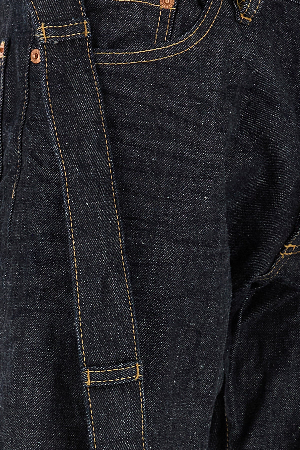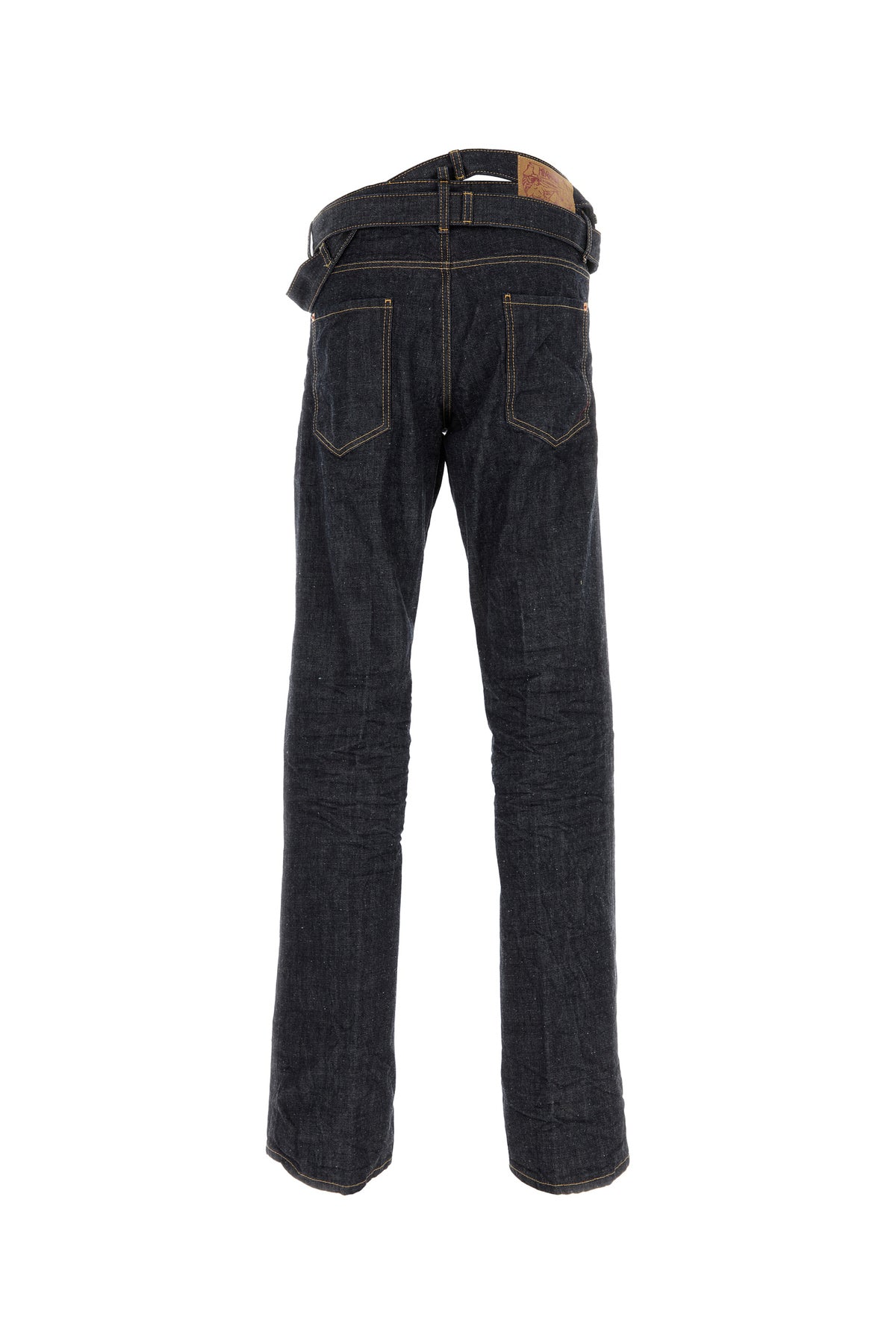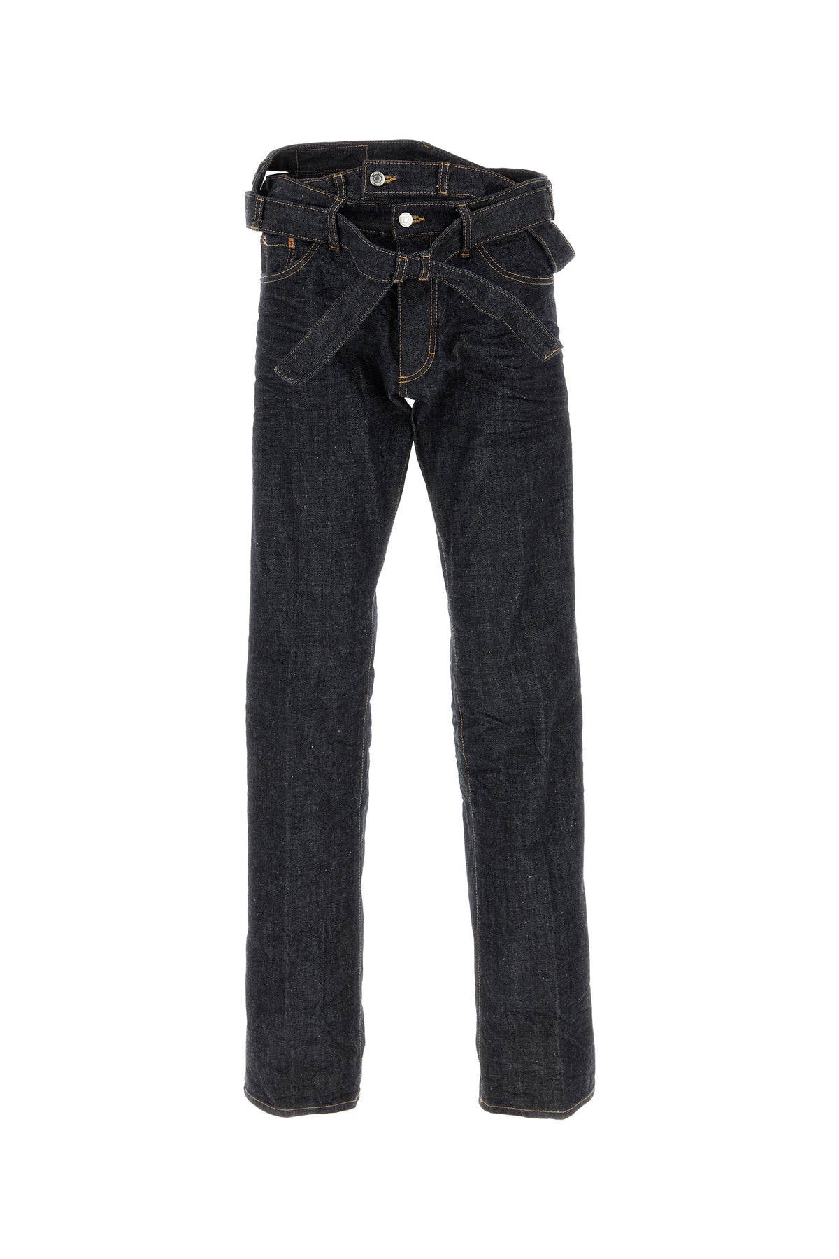 Jeans realized in pure cotton denim enriched by crossed denim inserts at the waist.