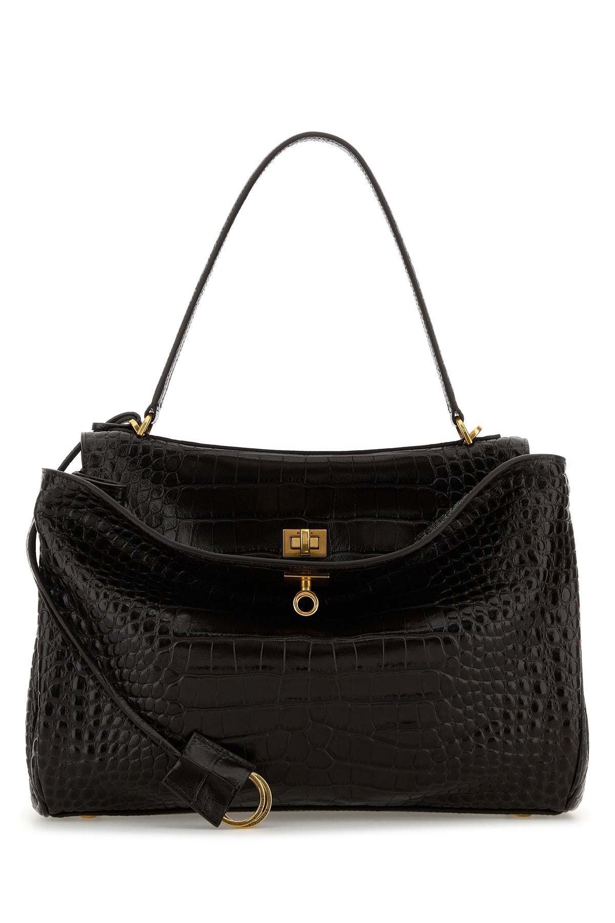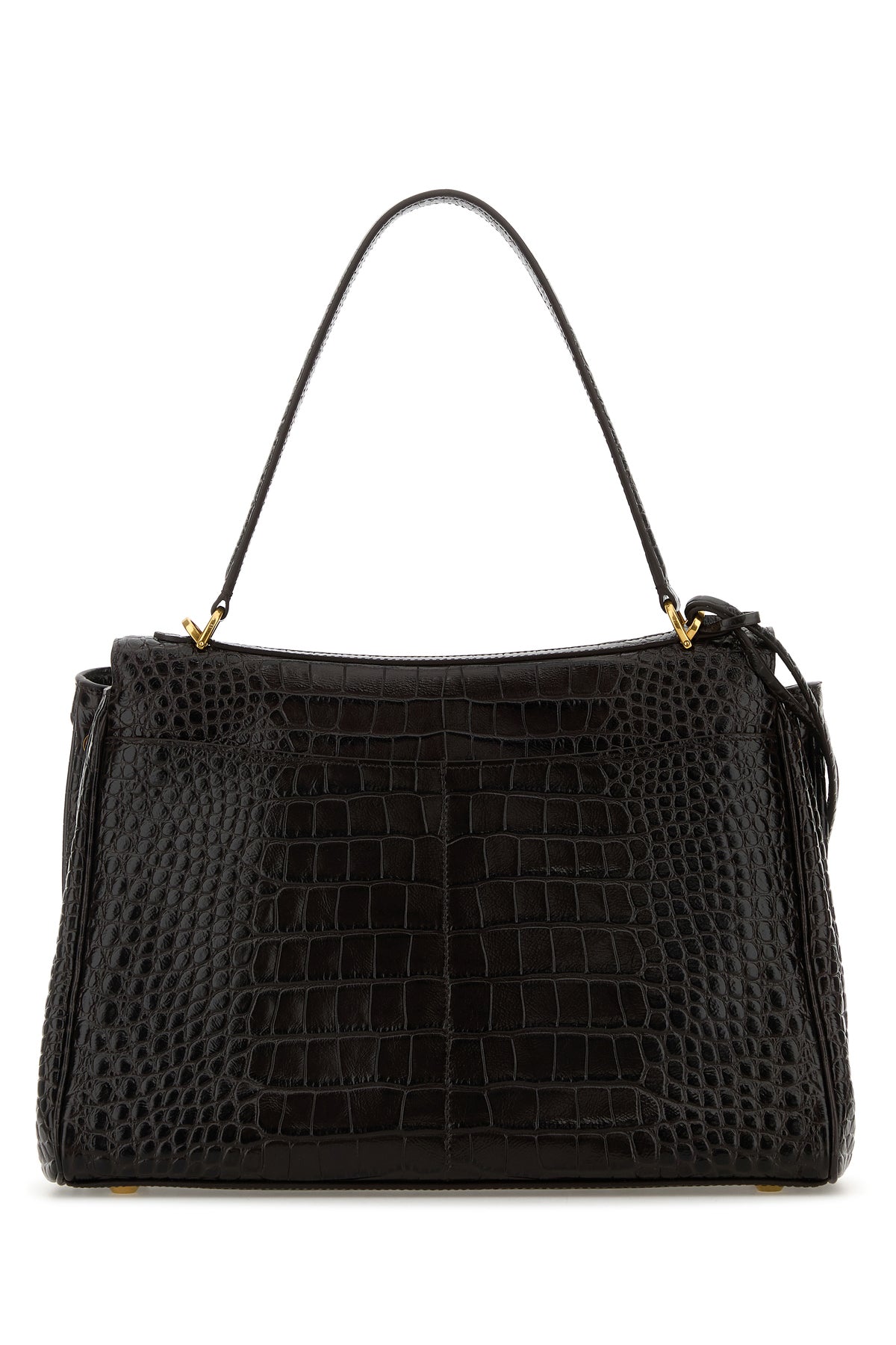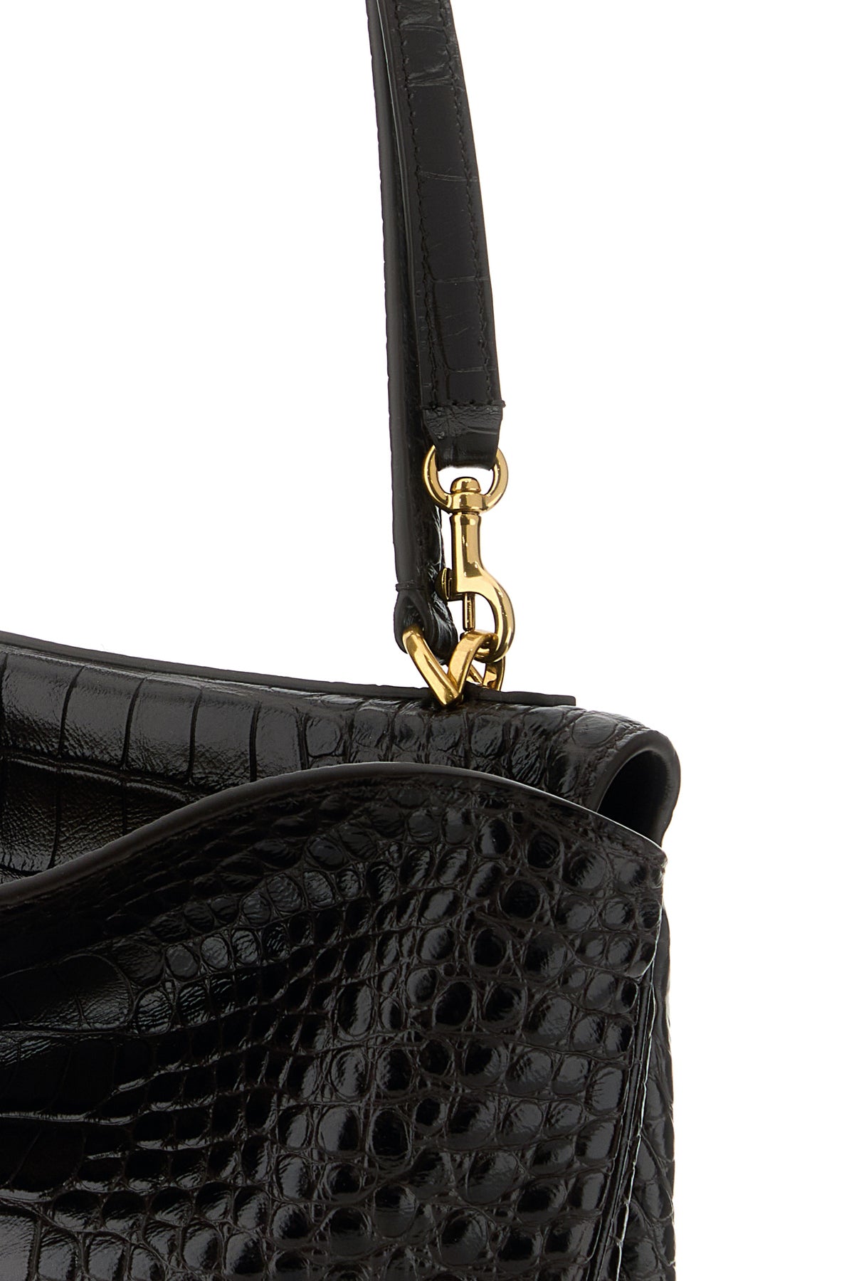 Handbag realized in crocodile embossed leather characterized by snap-fit closure.