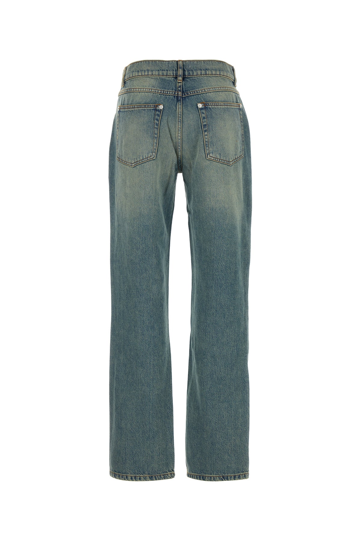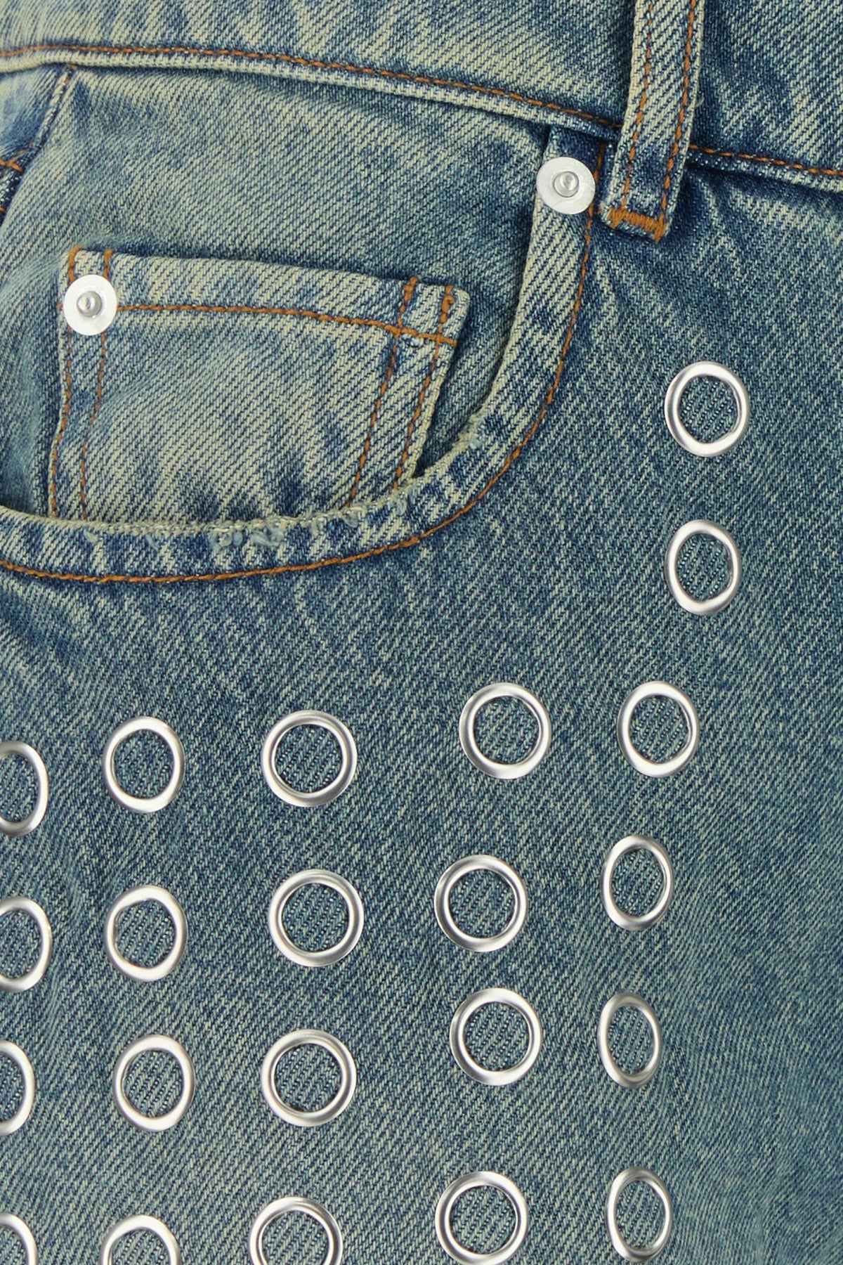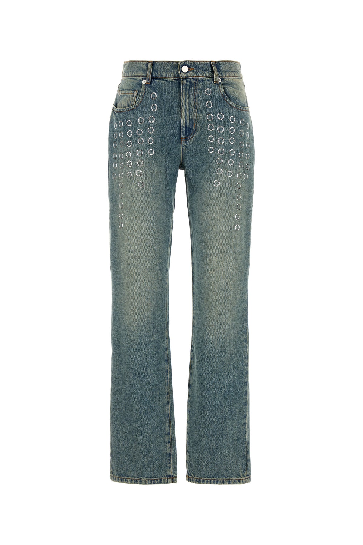 Jeans realized in vintage-effect stonewashed cotton blend denim enriched by metal studs at the front.