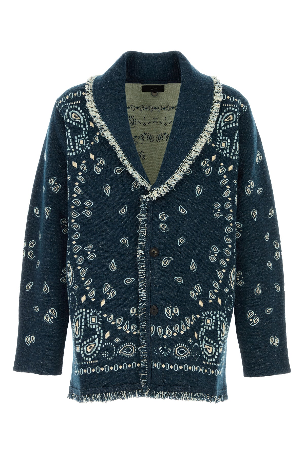 Cardigan realized in cashmere and linen jacquard characterized by Bandana embroidery on the entire surface.