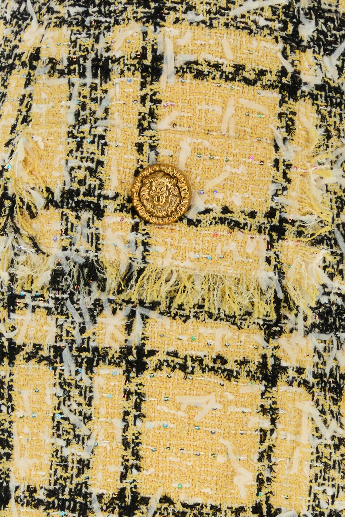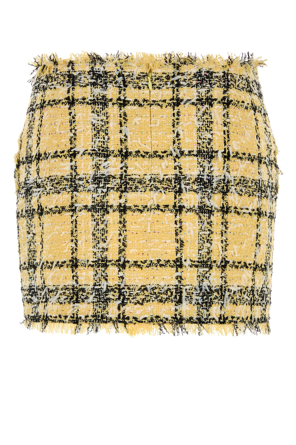 Mini skirt realized in tweed characterized by checked embroidery on the entire surface enriched by metal Lion Head buttons at the front.