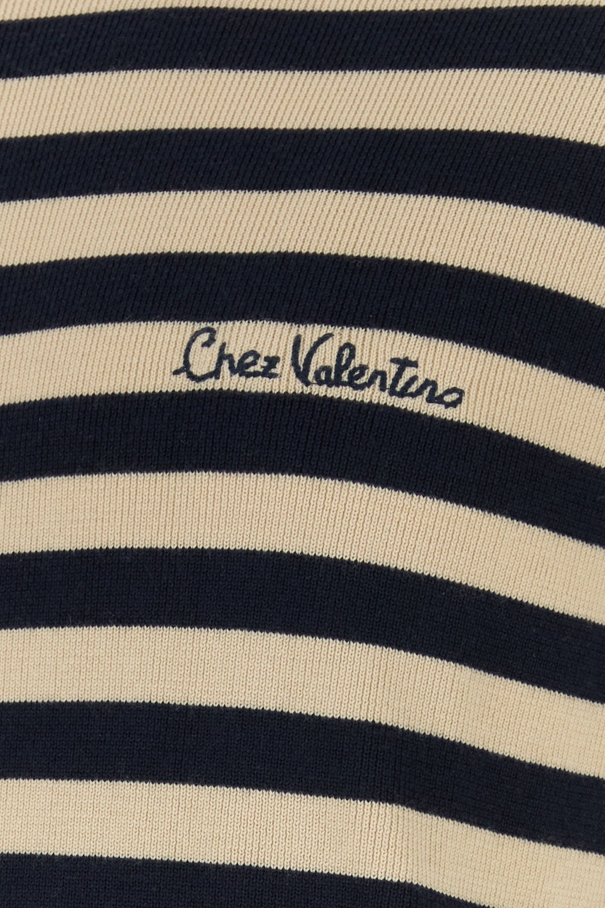 Sweater realized in pure virgin wool characterized by striped embroidery on the entire surface and embroidered logo on the chest.