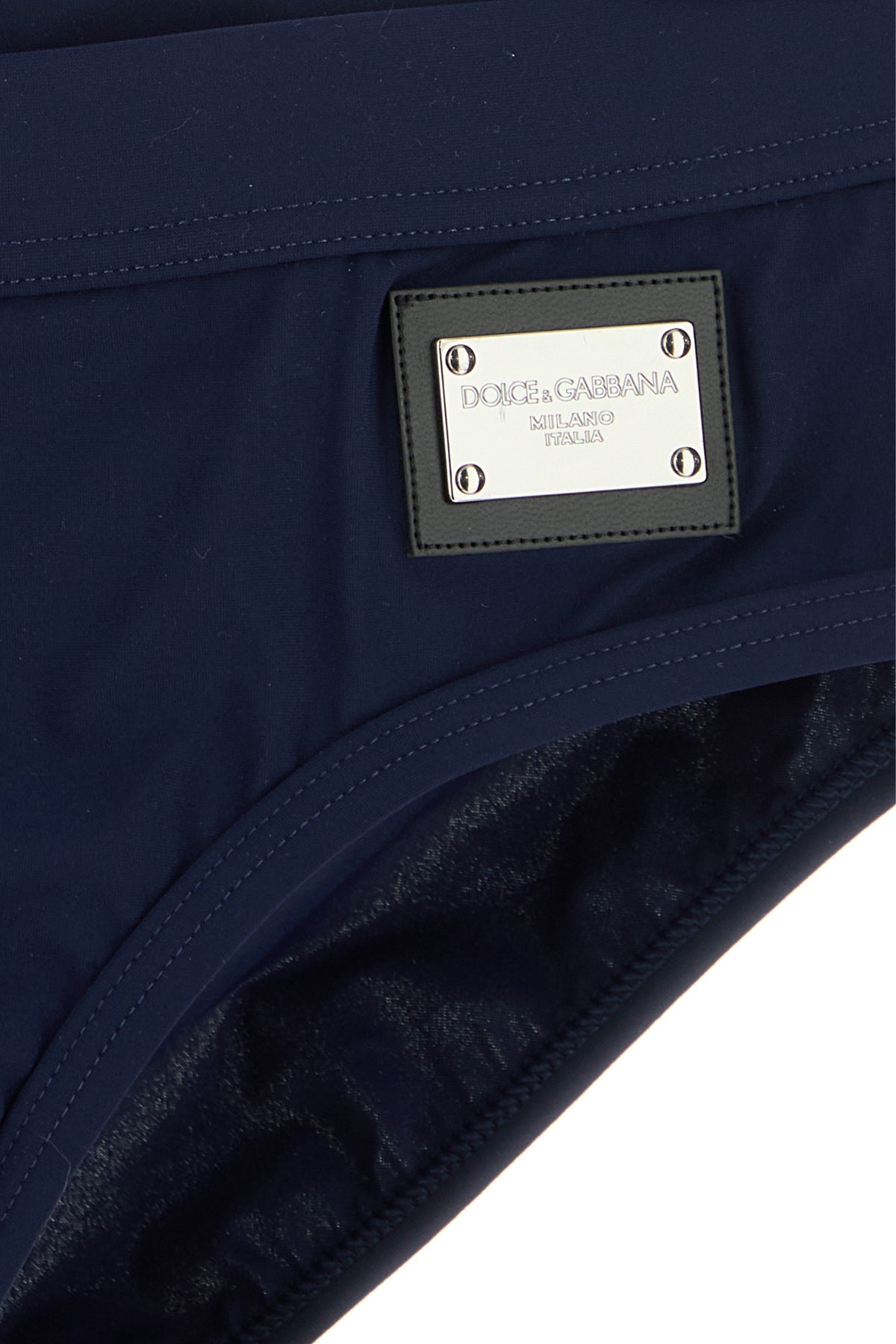 Swimming brief realized in stretch nylon enriched by logoed metal plate on the side.