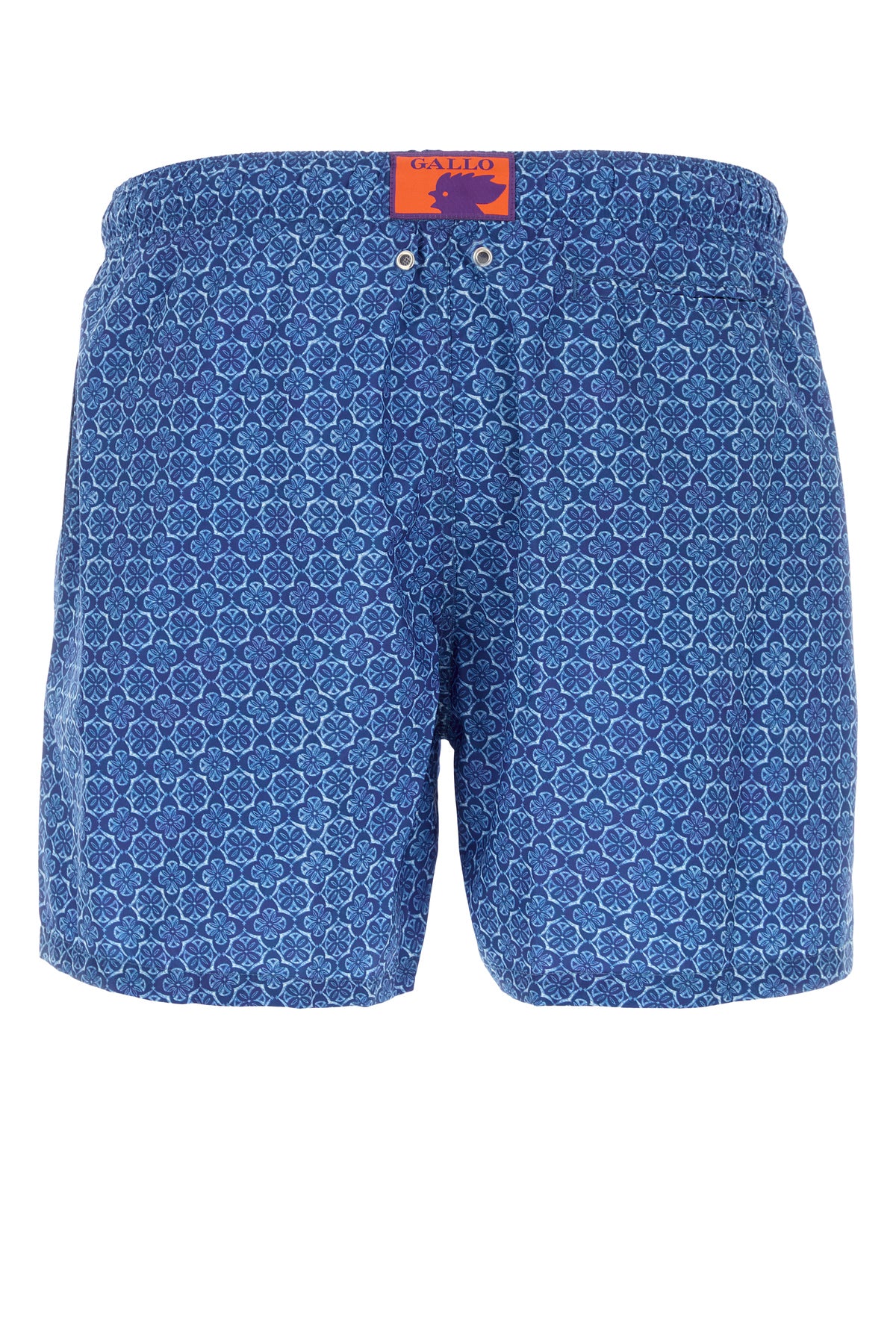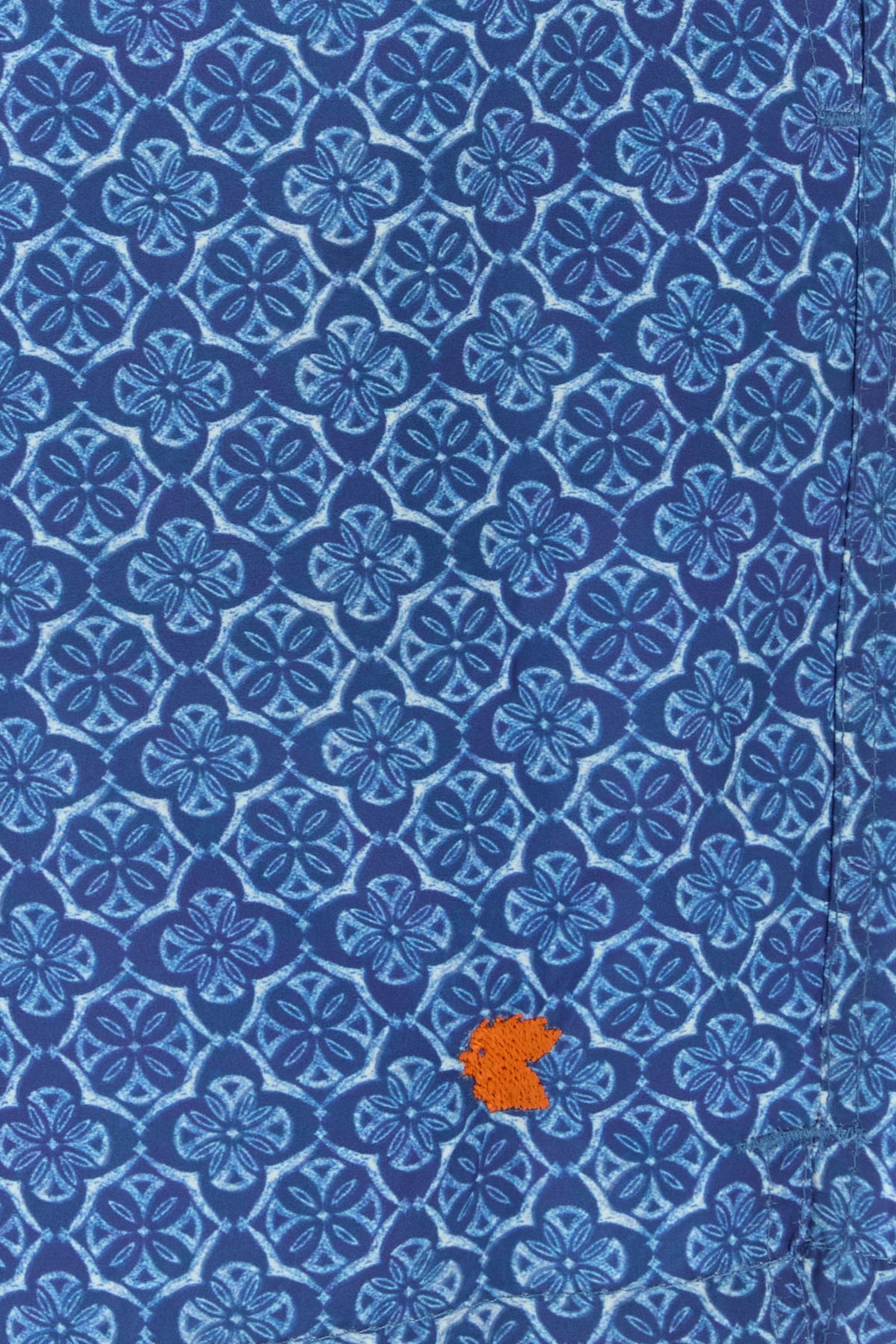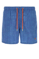 Swimming shorts realized in polyester characterized by peculiar embroidery on the entire surface and logoed embroidery on the hemline enriched by logoed label at the back.