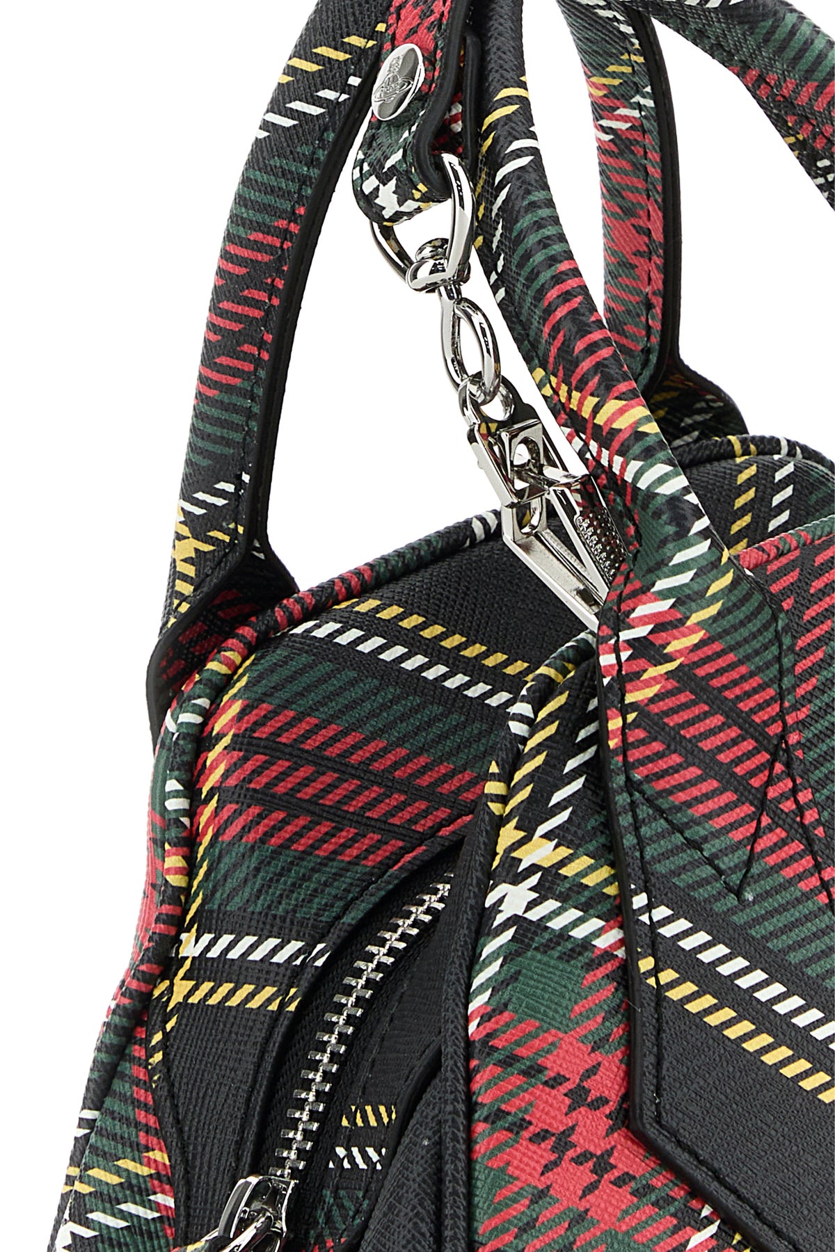 Handbag realized in grained synthetic leather characterized by tartan motif print on the entire surface enriched by metal Orb detail at the front.