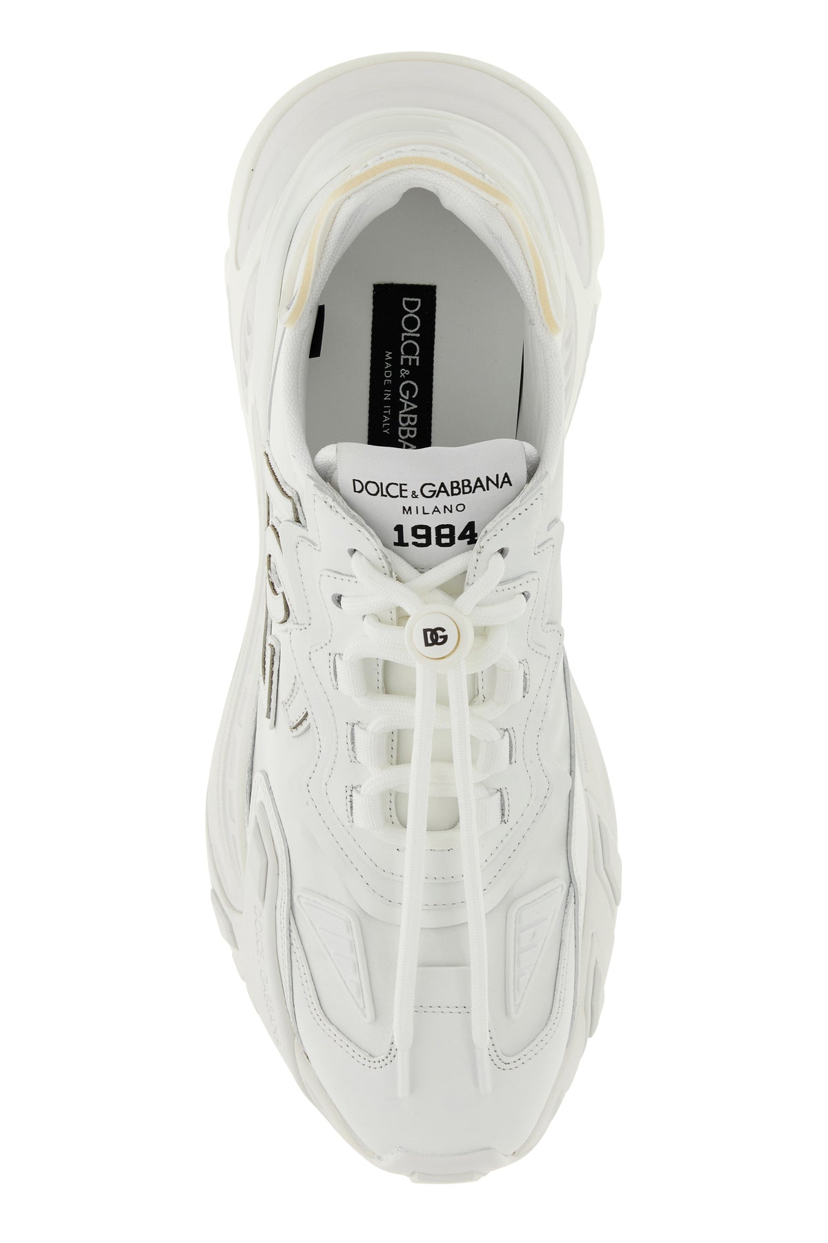 Sneakers realized in fabric with leather inserts characterized by embossed logo on the toe and logo in relief on the heel enriched by DG patch on the side.