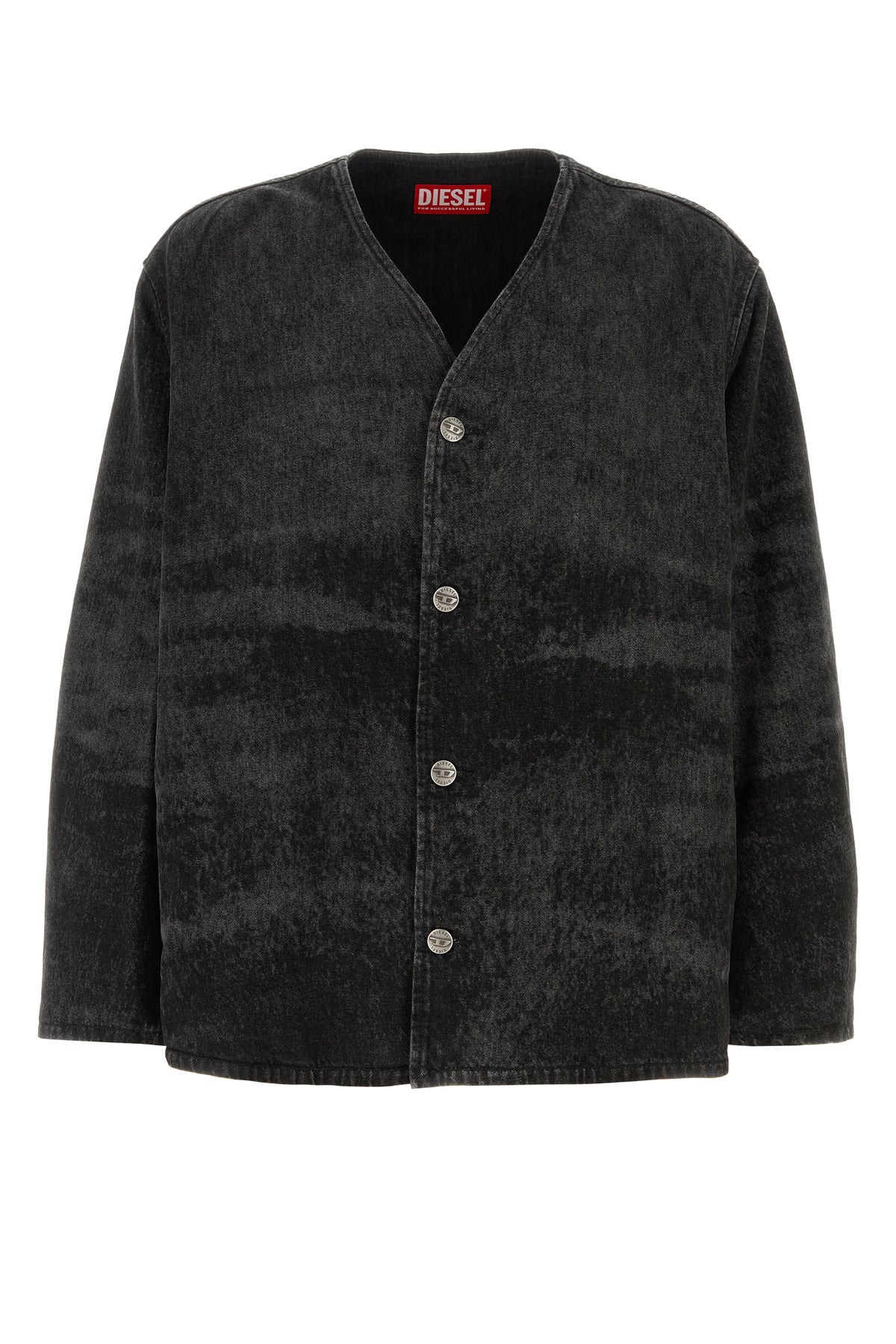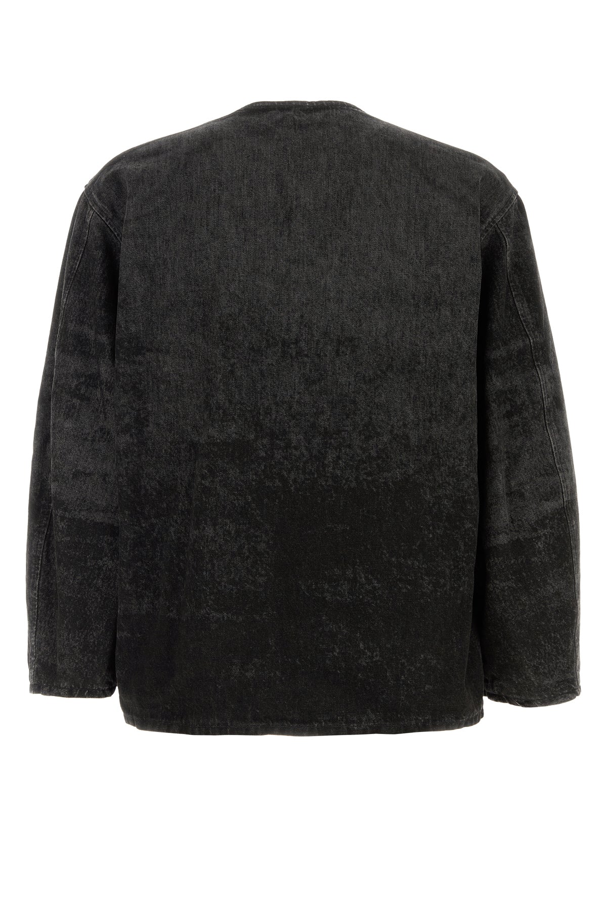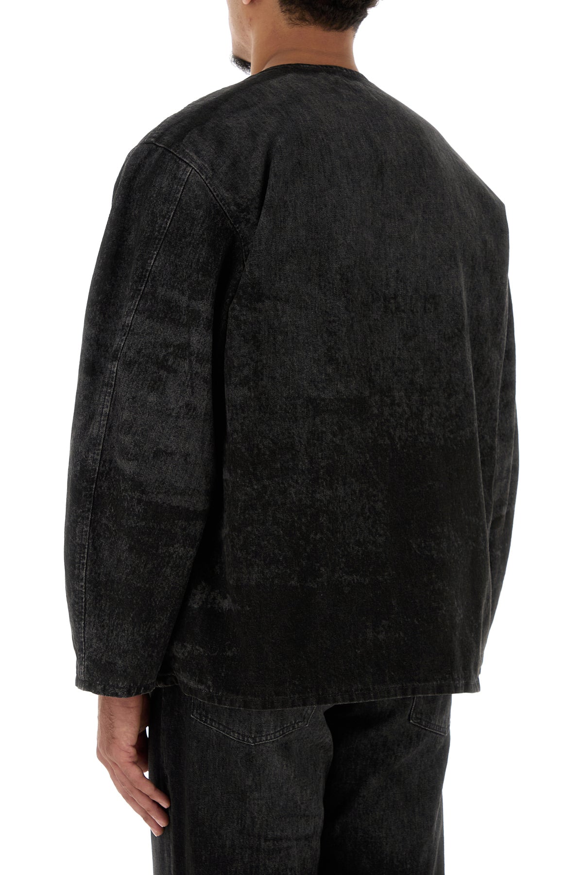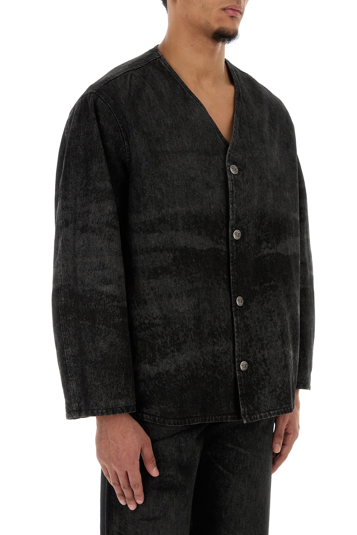 Jacket realized in stonewashed cotton and hemp denim characterized by V neckline.