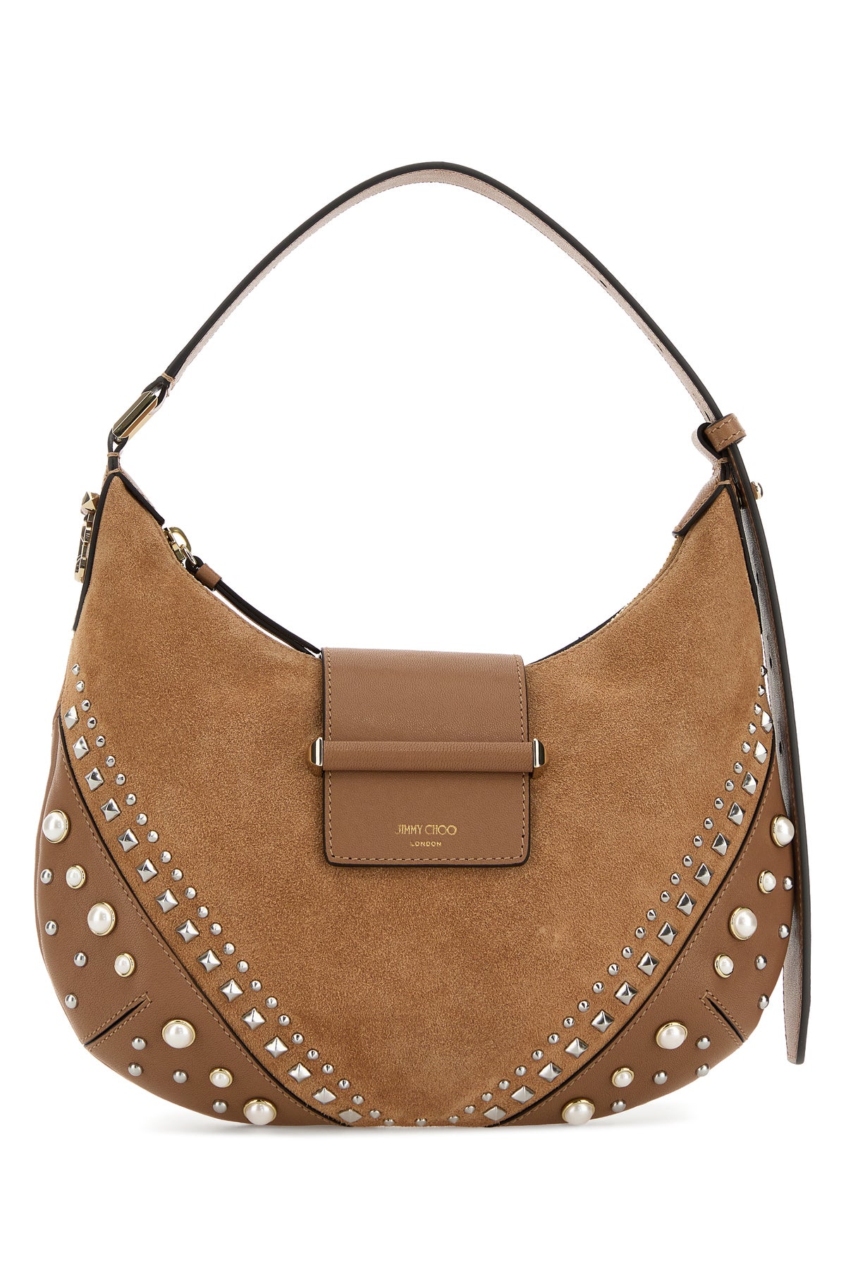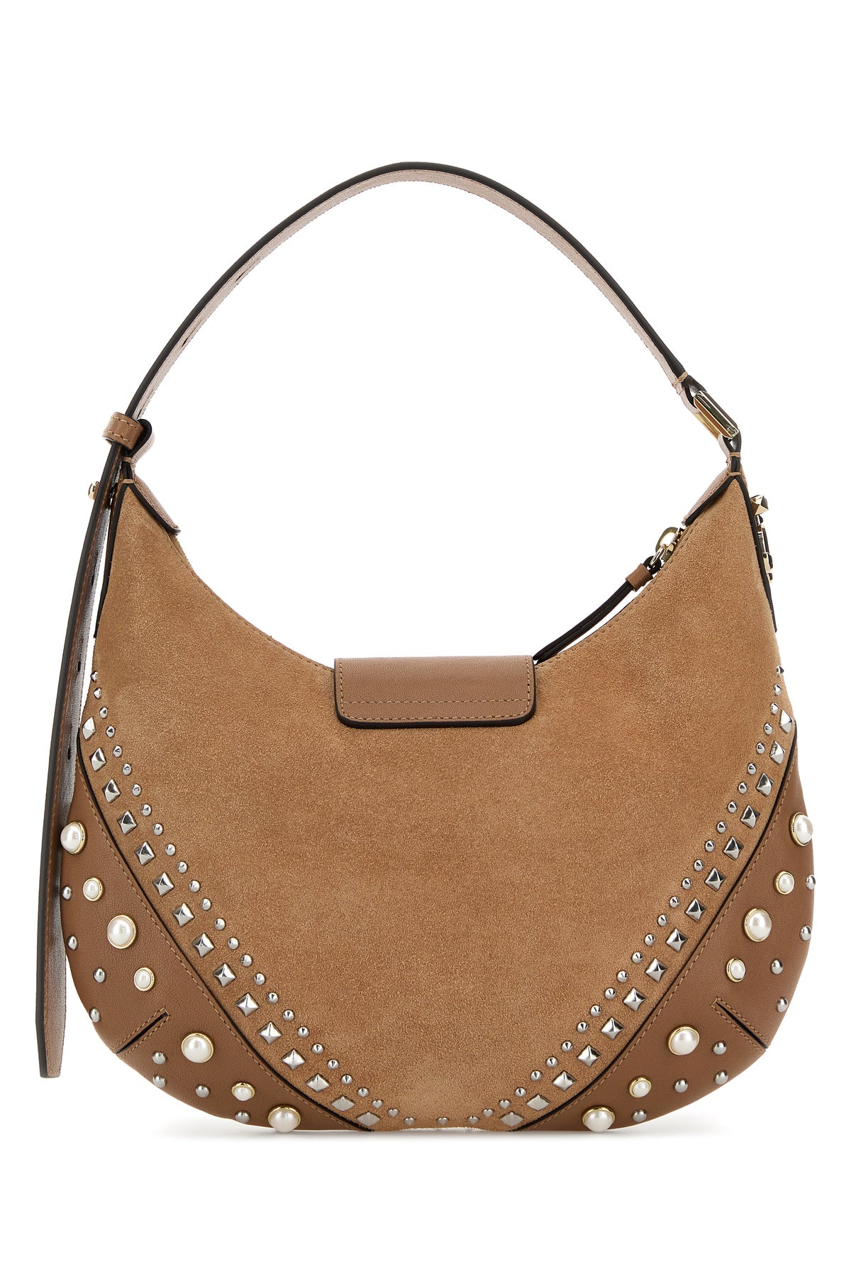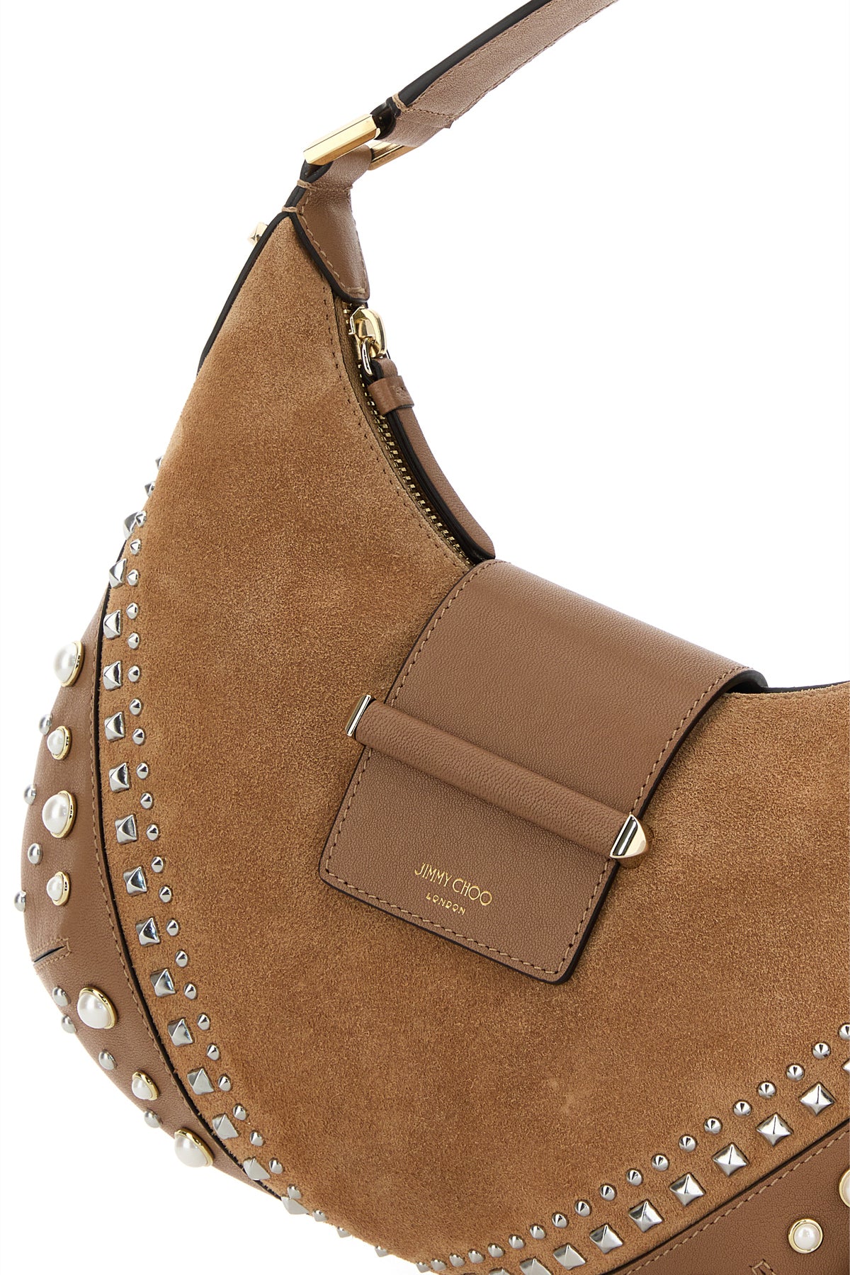 Shoulder bag realized in suede characterized by laminated printed logo at the front enriched by studs on the sides.