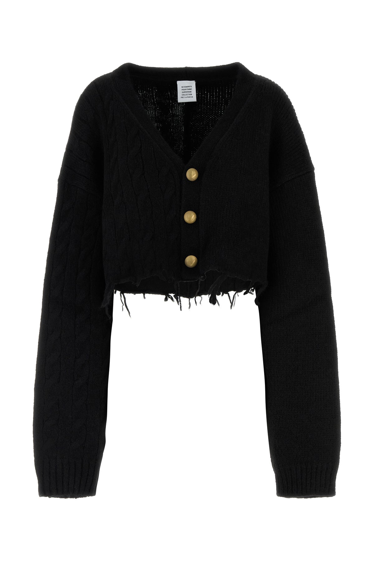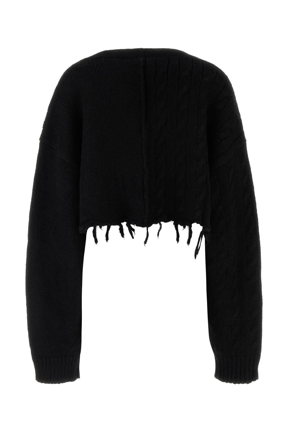 Cropped-cut cardigan realized in alpaca blend characterized by distressed effect hemline.