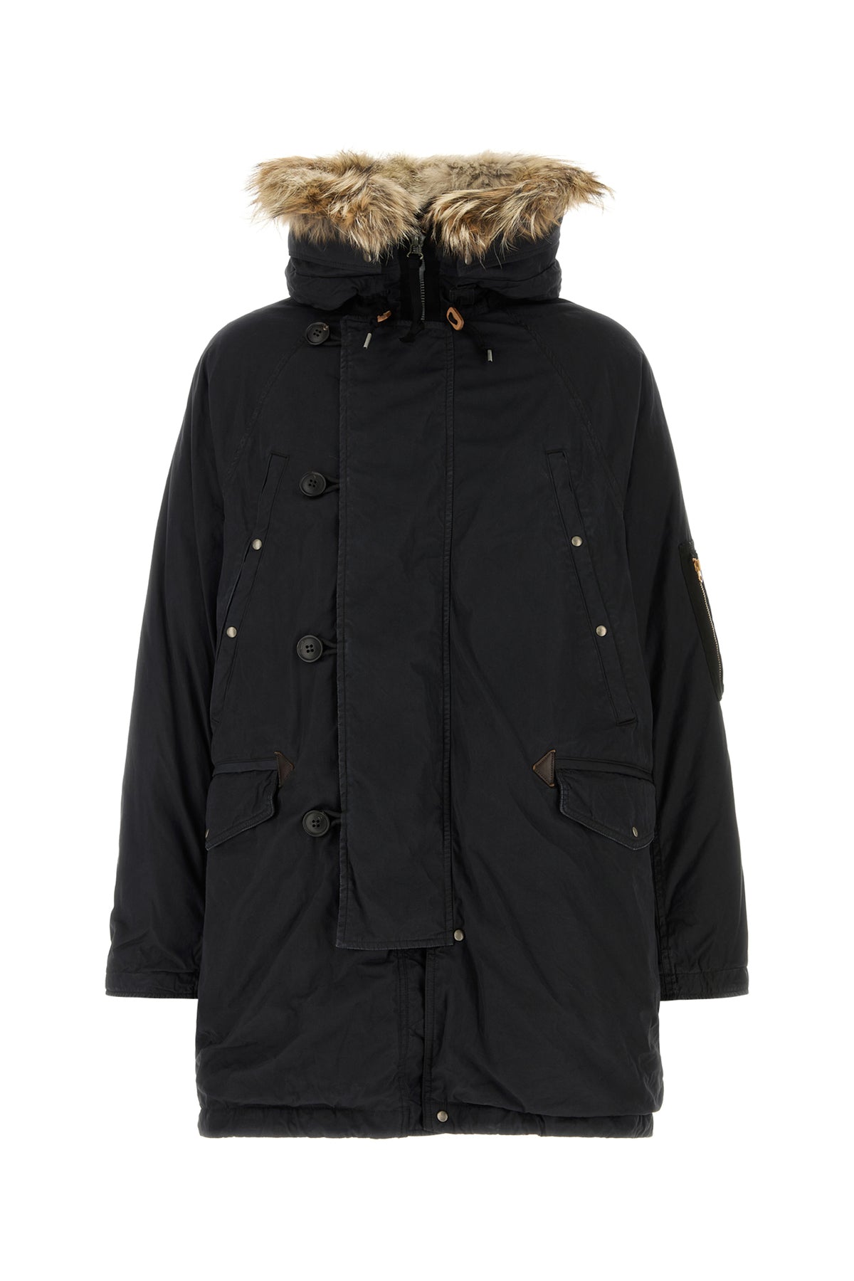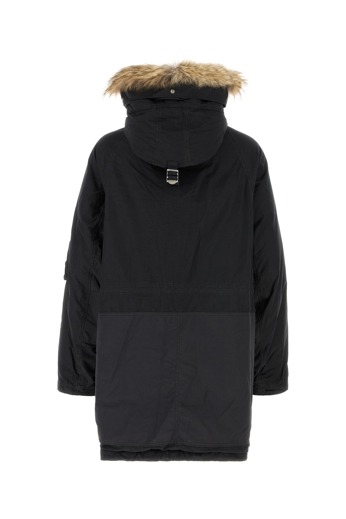 Down jacket realized in cotton and nylon enriched by fur insert at the neck.