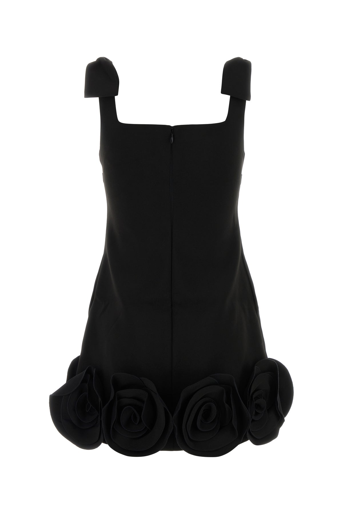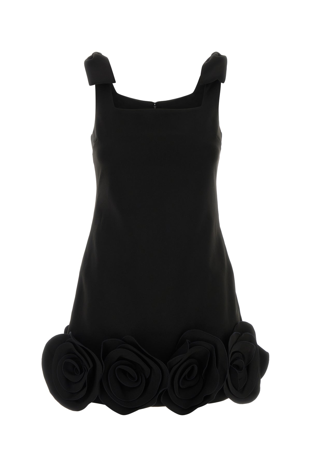 Mini dress realized in crepe enriched by decorative bows on the shoulder straps and floral patches on the hemline.