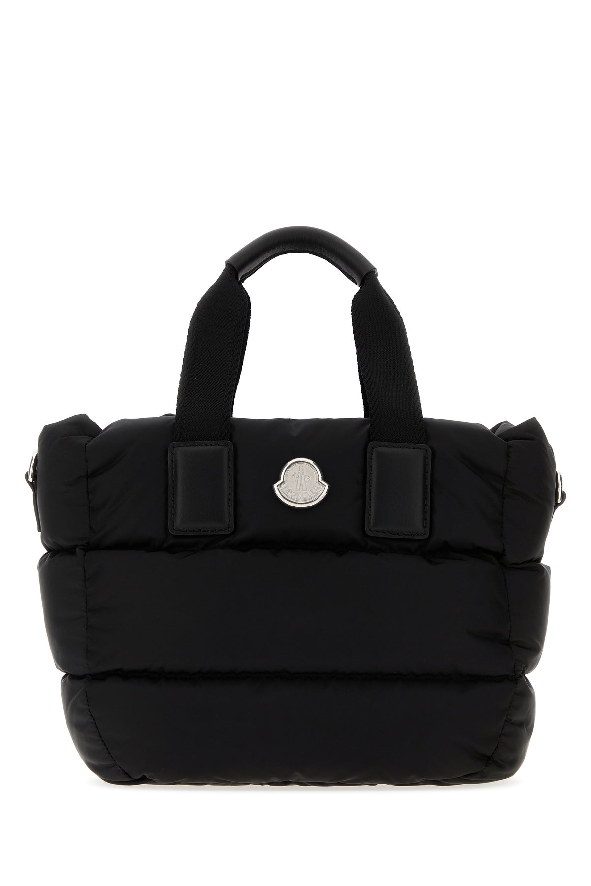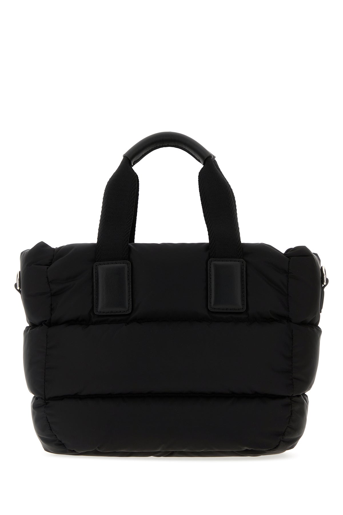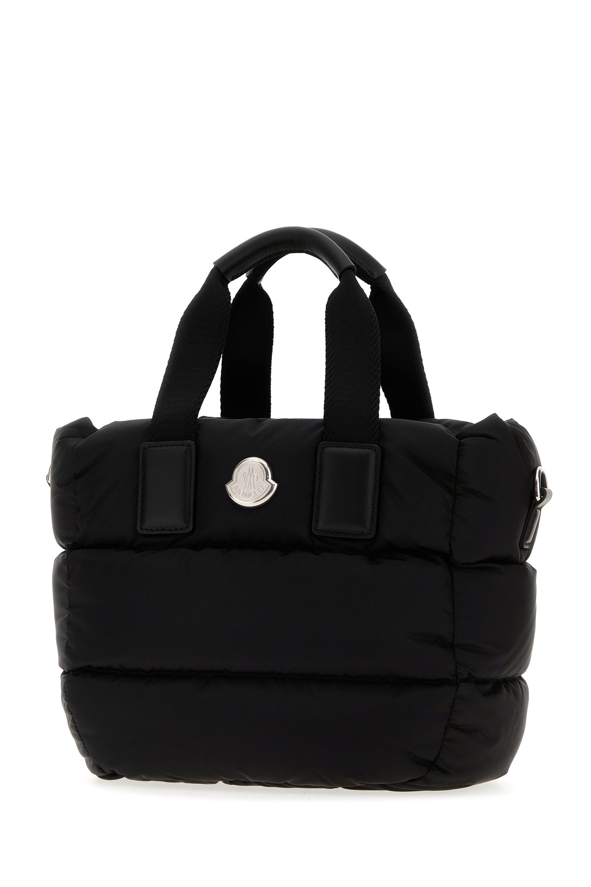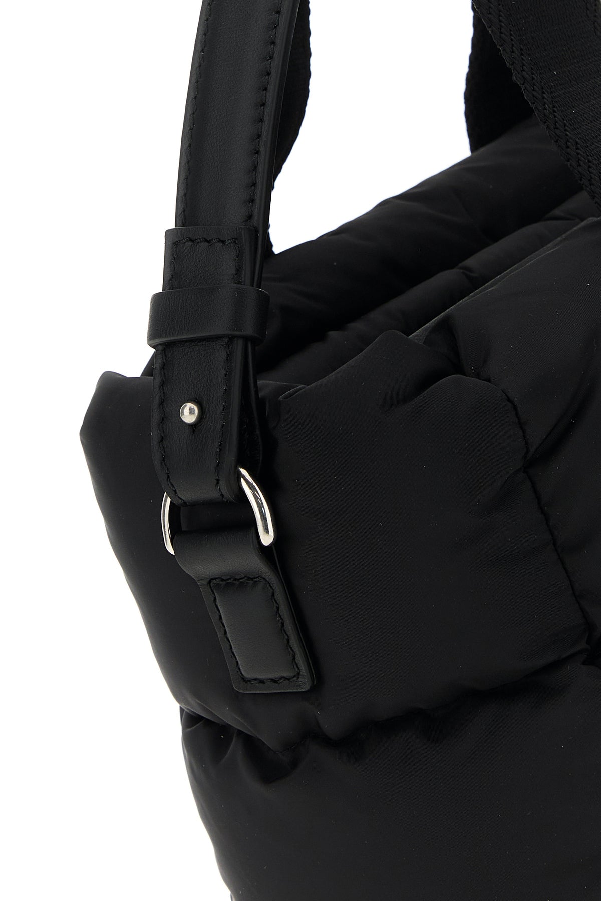 Handbag realized in quilted fabric enriched by logoed metal detail at the front.