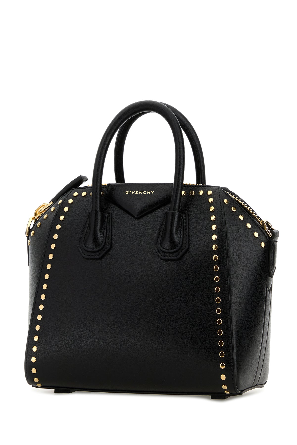 Handbag realized in smooth calf leather characterized by laminated printed logo at the front enriched by metal studs on the trimmings.