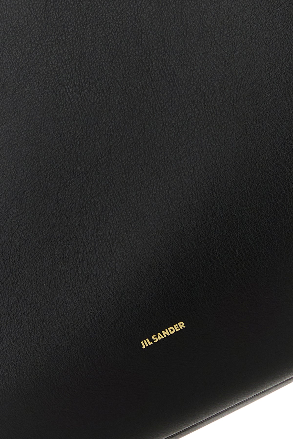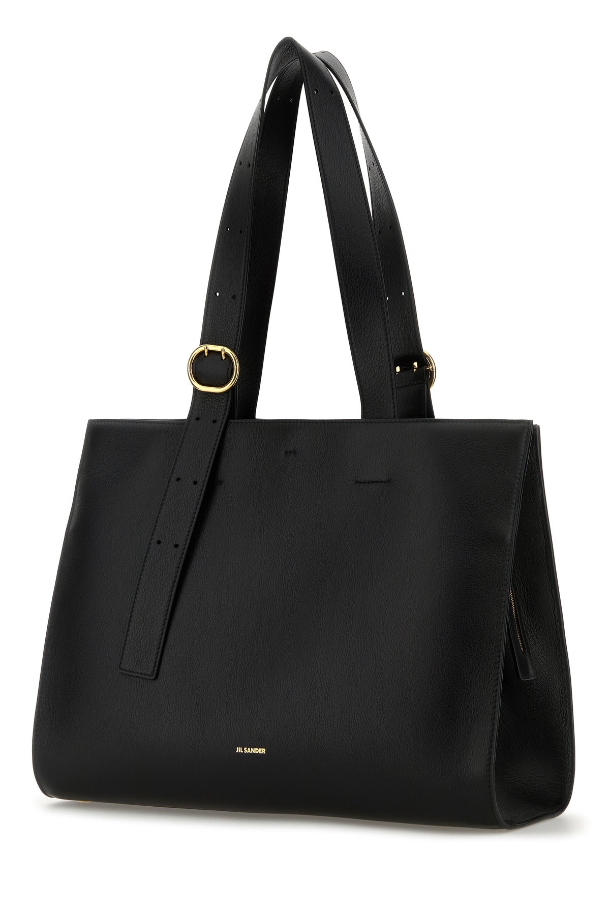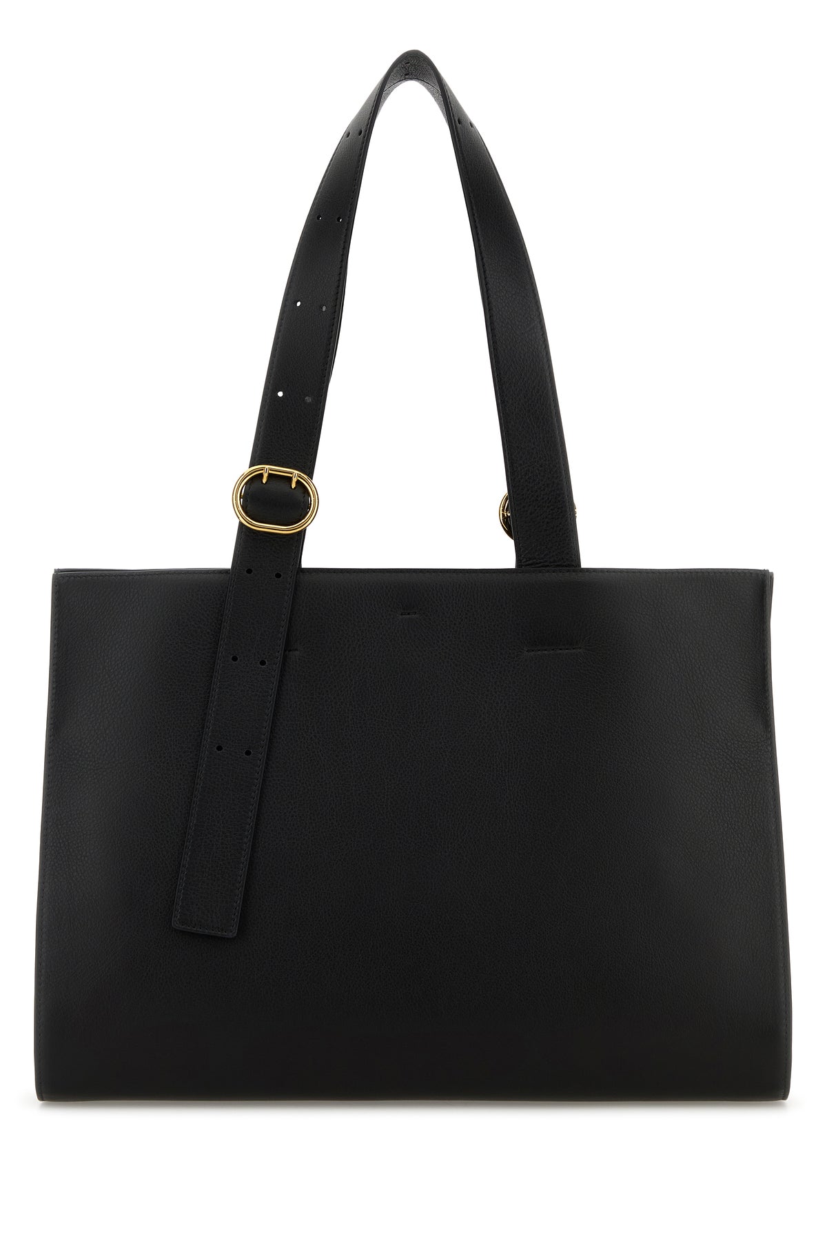 Shopping bag realized in pebble leather characterized by laminated printed logo at the front.