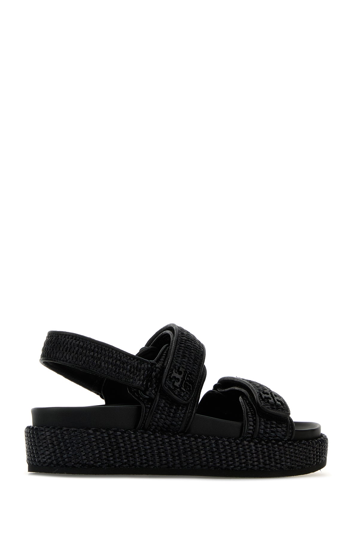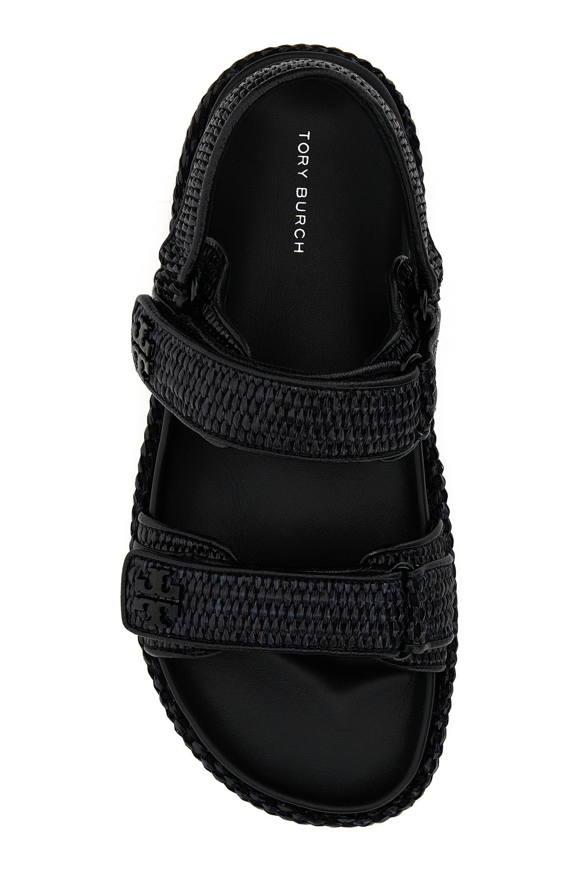 Sandals realized in woven raffia with tonal leather trimmings enriched by metal logoed details on the bands.