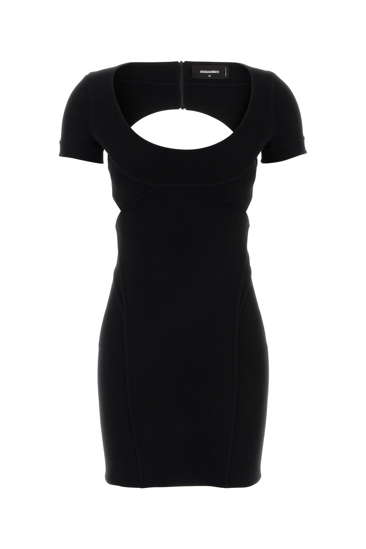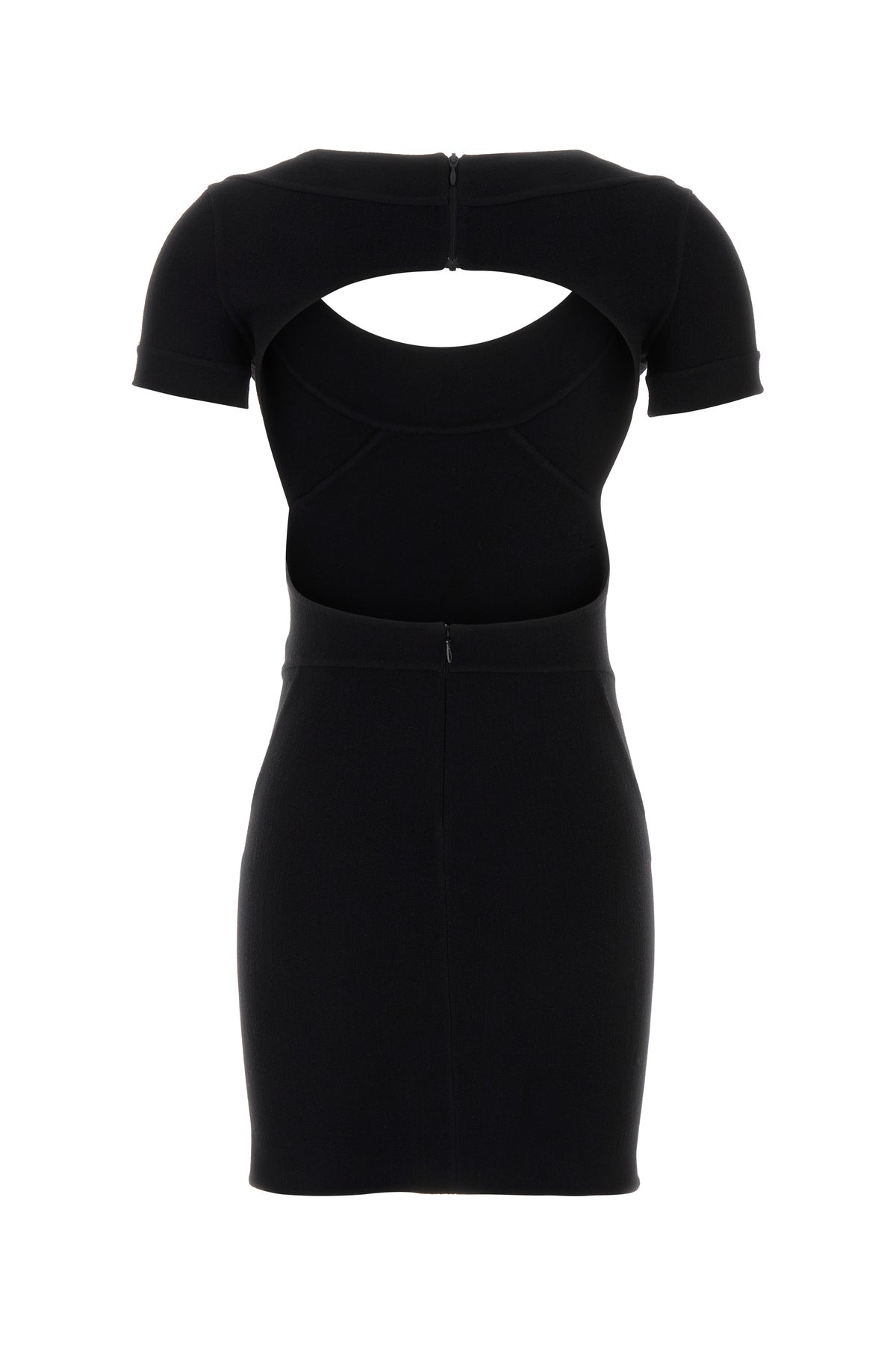 Fitted mini dress realized in stretch virgin wool blend characterized by backless.