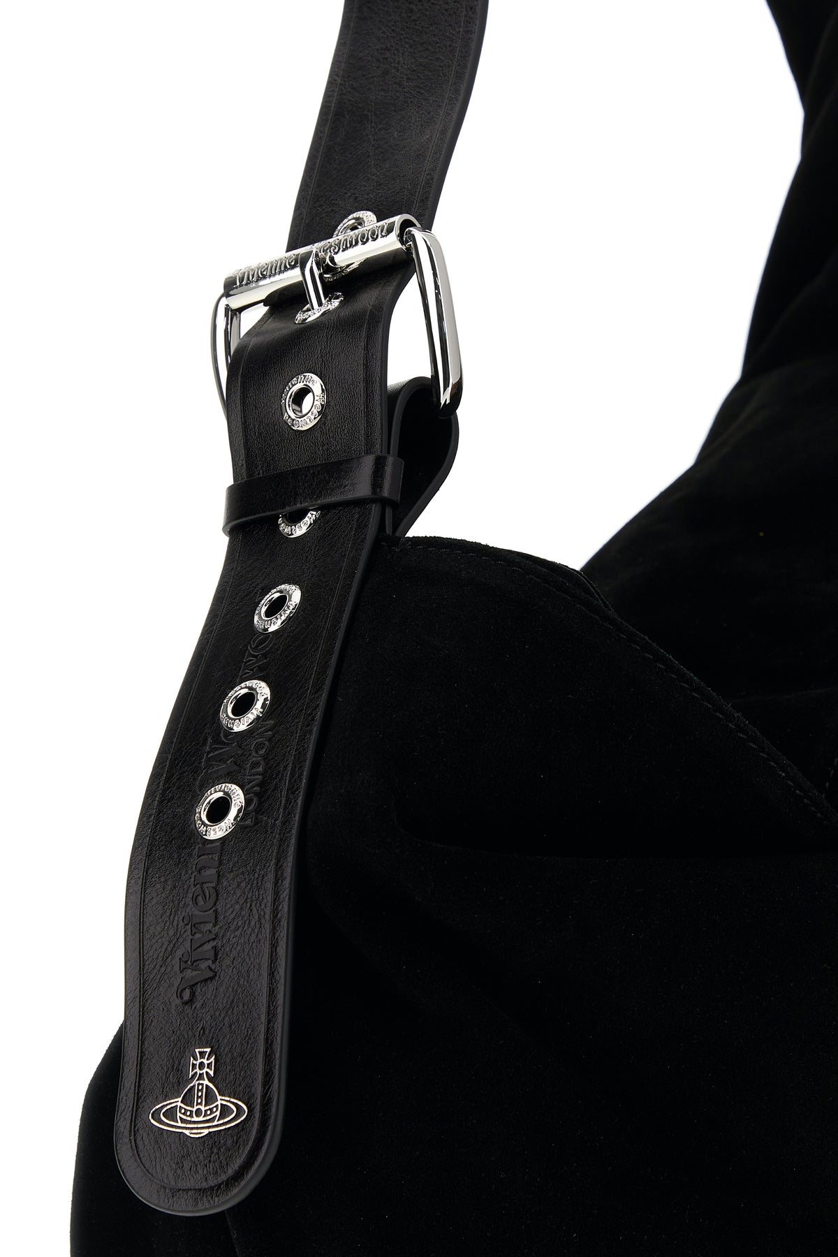 Shopping bag realized in calf suede characterized by laminated printed Orb on the adjustable shoulder strap.