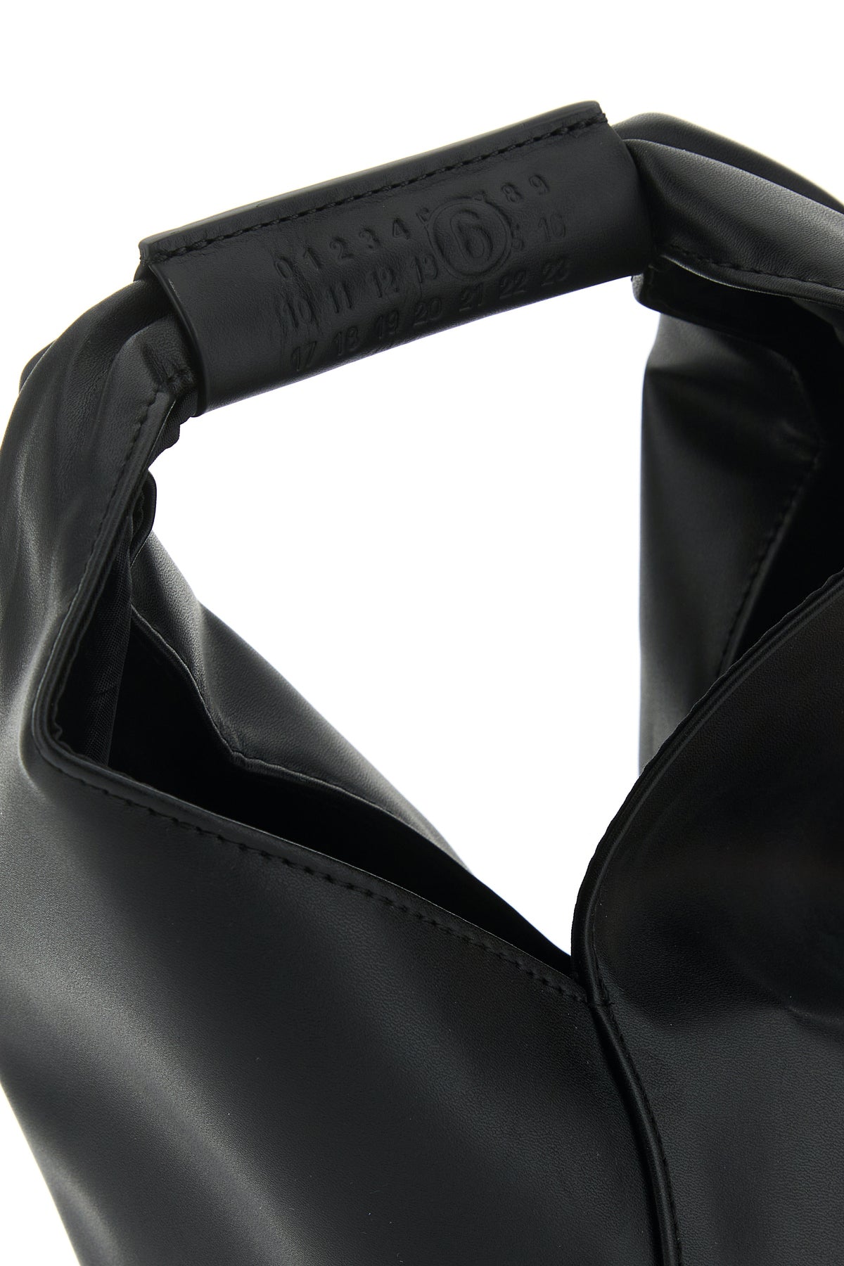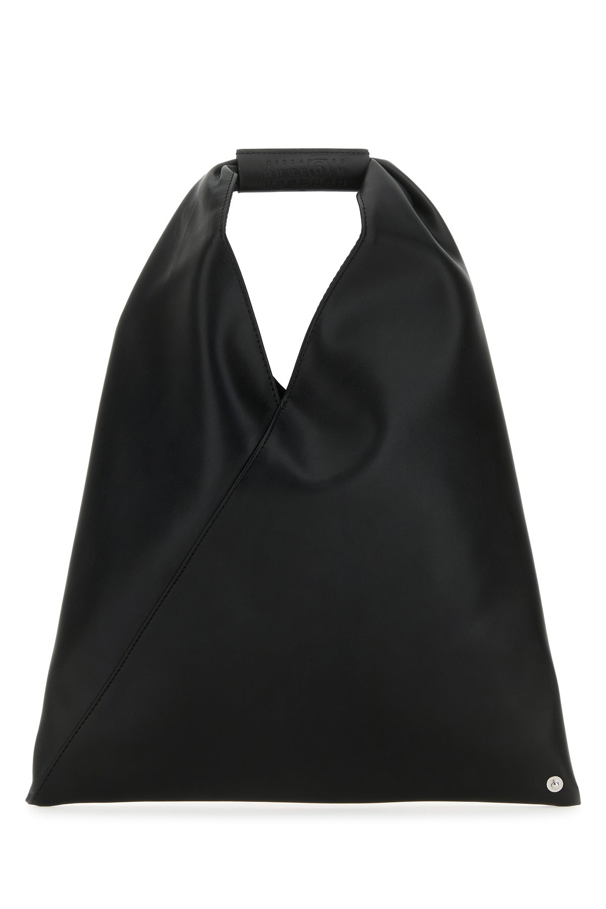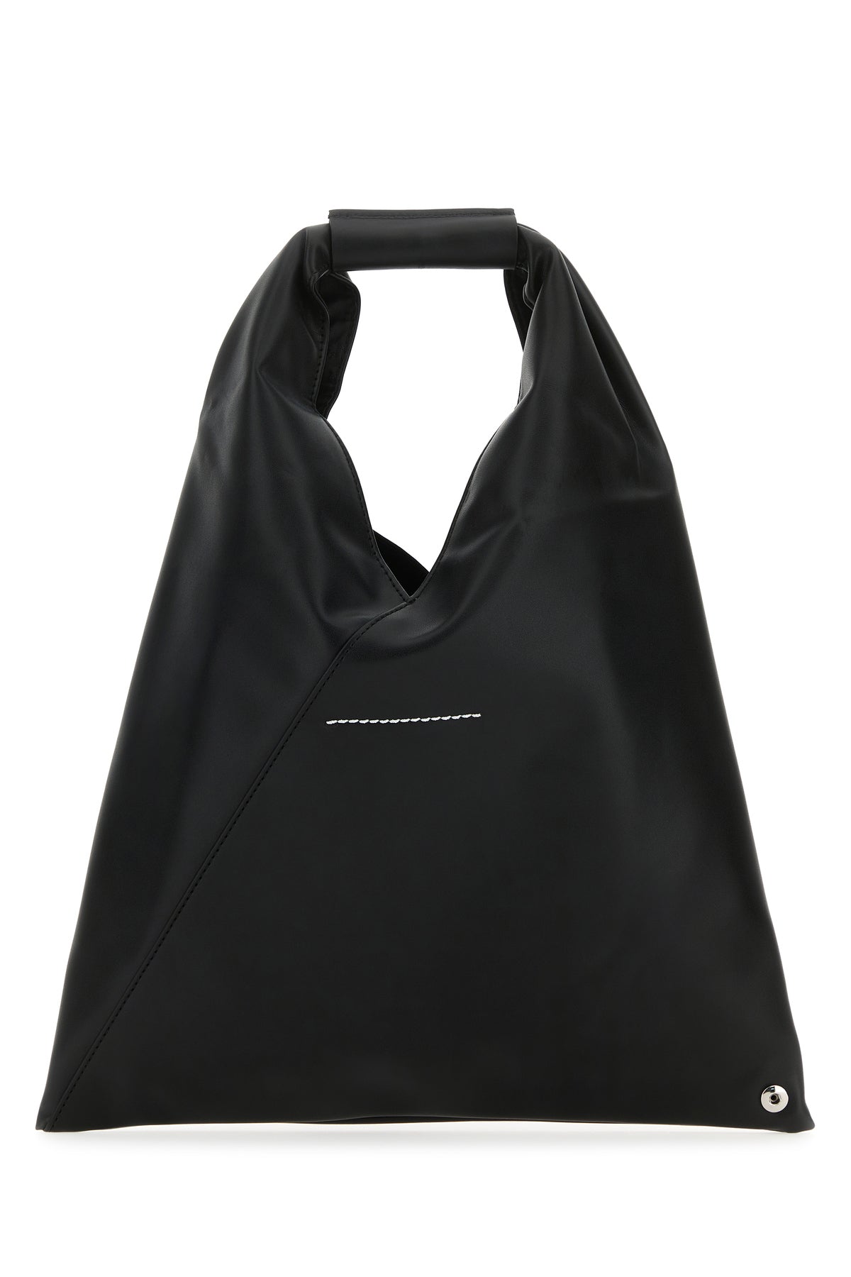 Handbag realized in synthetic leather characterized by iconic contrasting stitching at the back enriched by tonal leather logoed patch on the built-in handle.