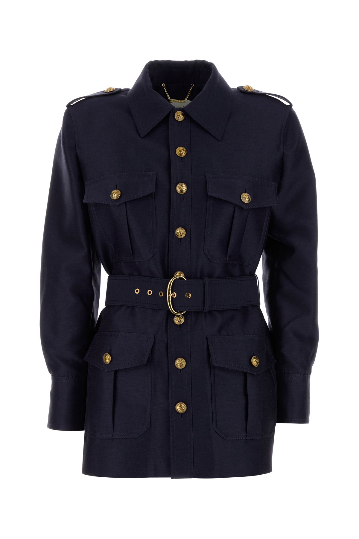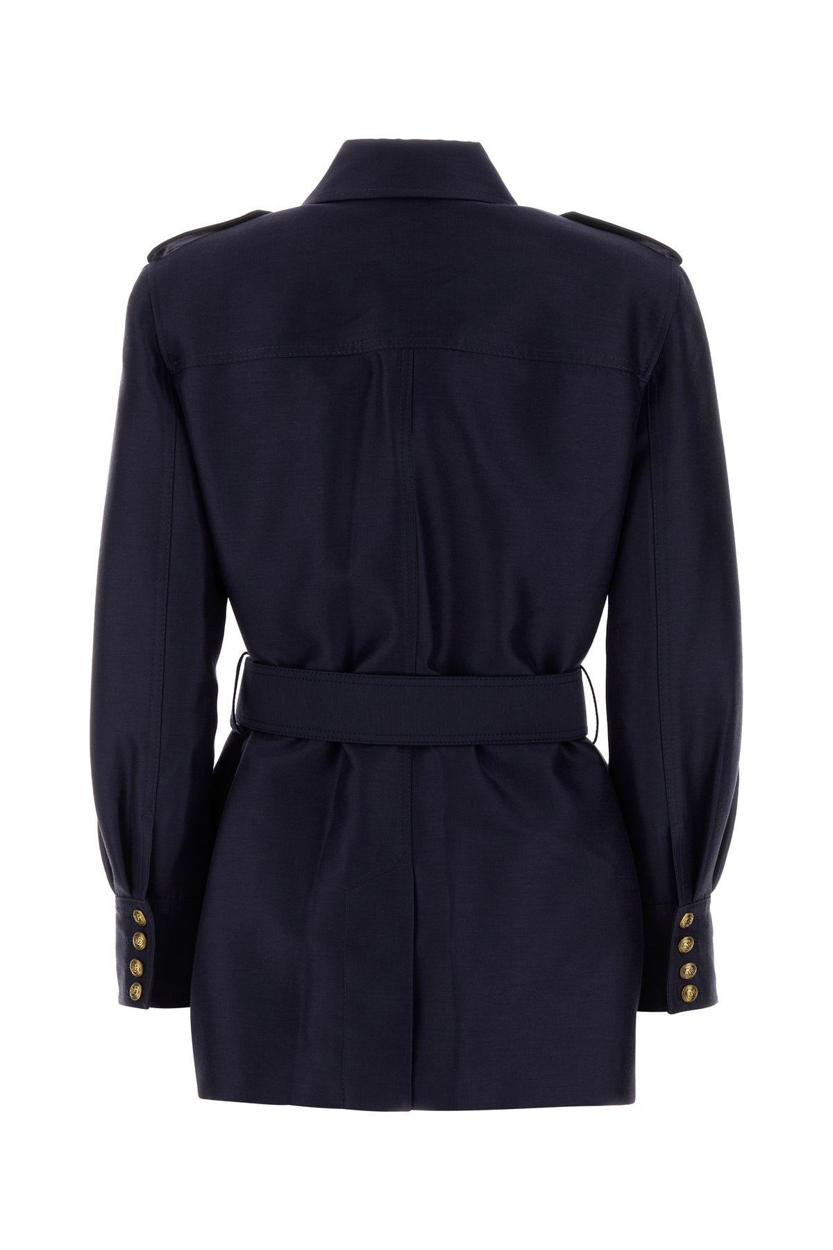 Jacket realized in wool and silk enriched by tonal fabric belt at the waist.