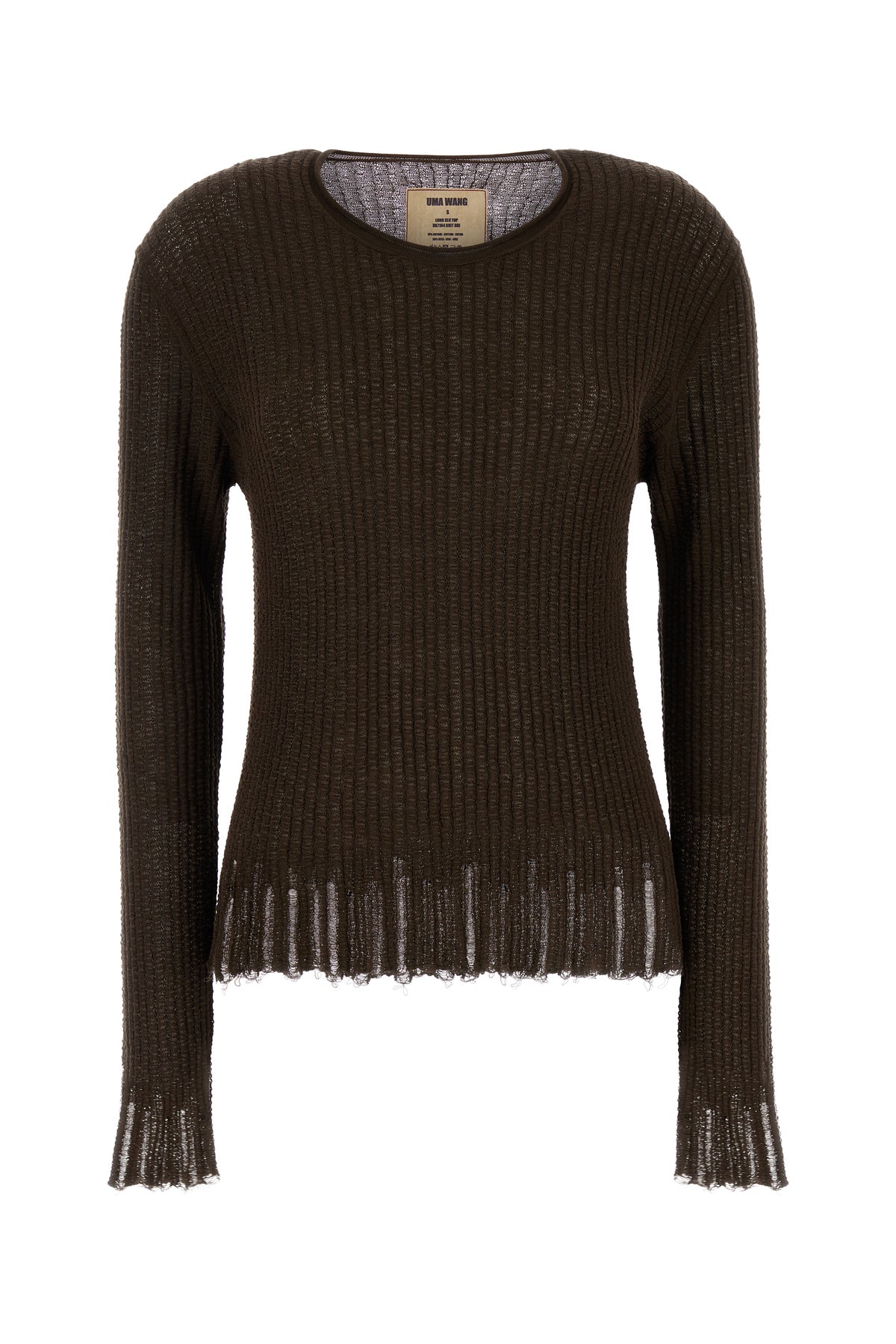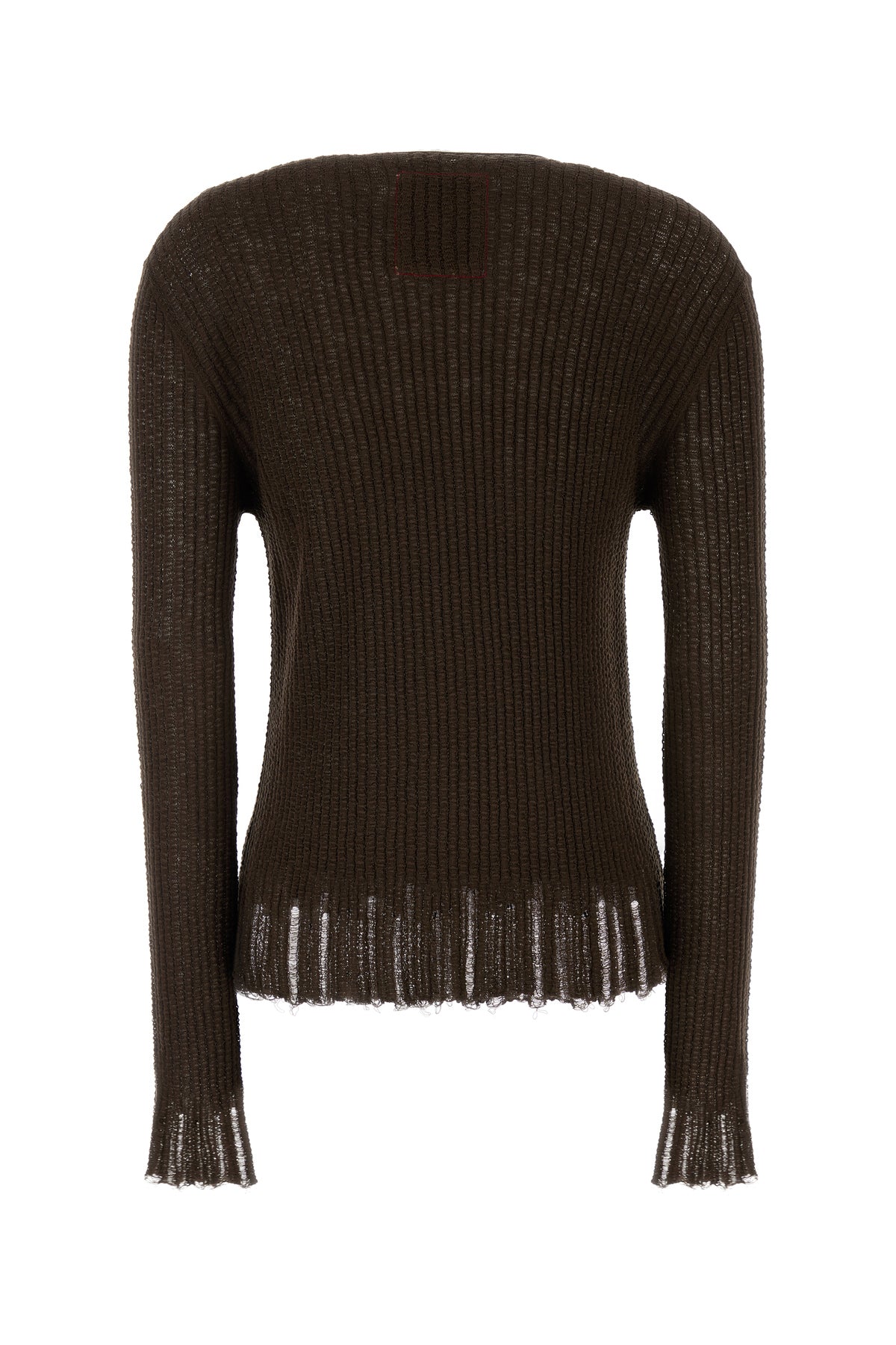 Sweater realized in ribbed cotton and silk characterized by distressed effect cuffs and hemline.