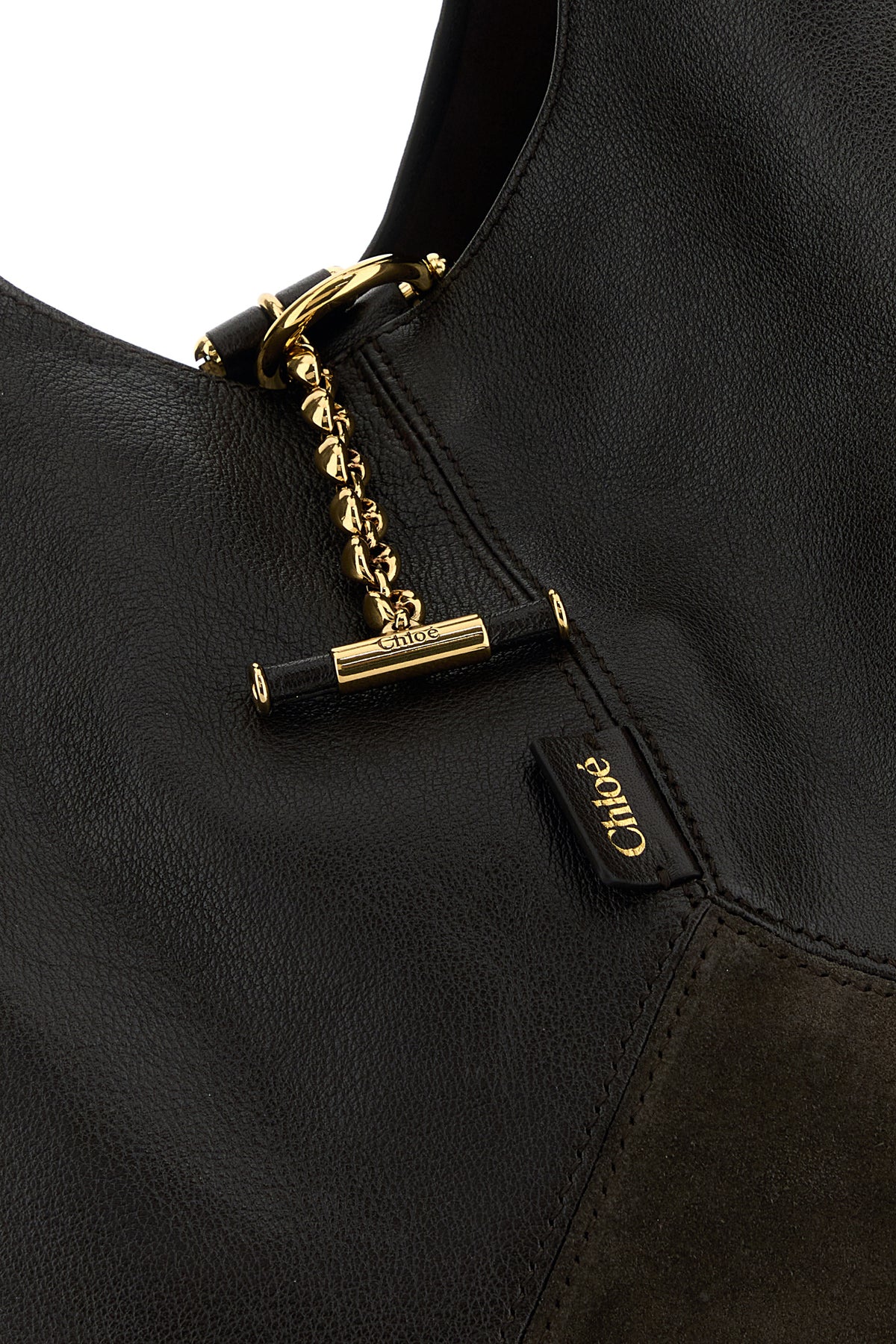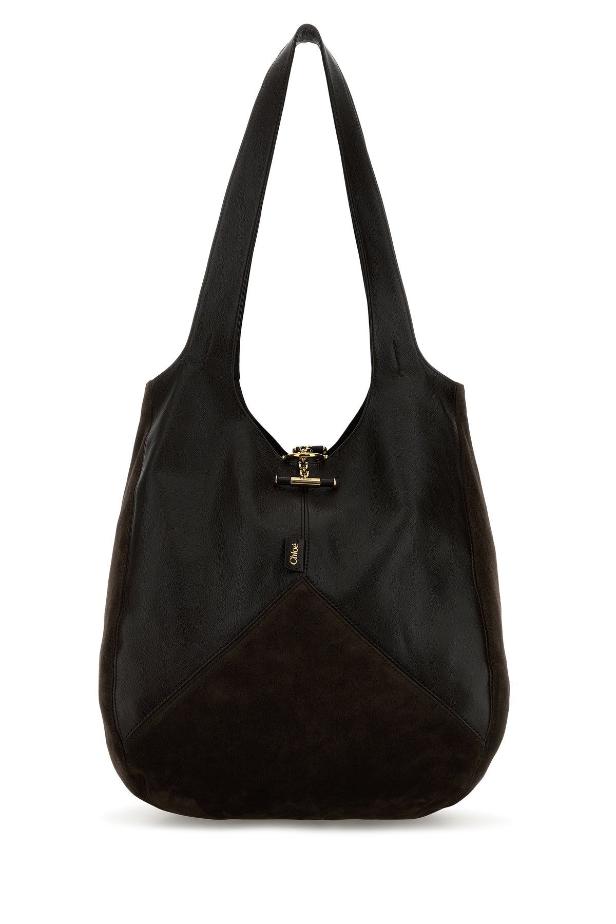 Shopping bag realized in suede and pebble leather enriched by logoed label at the front.