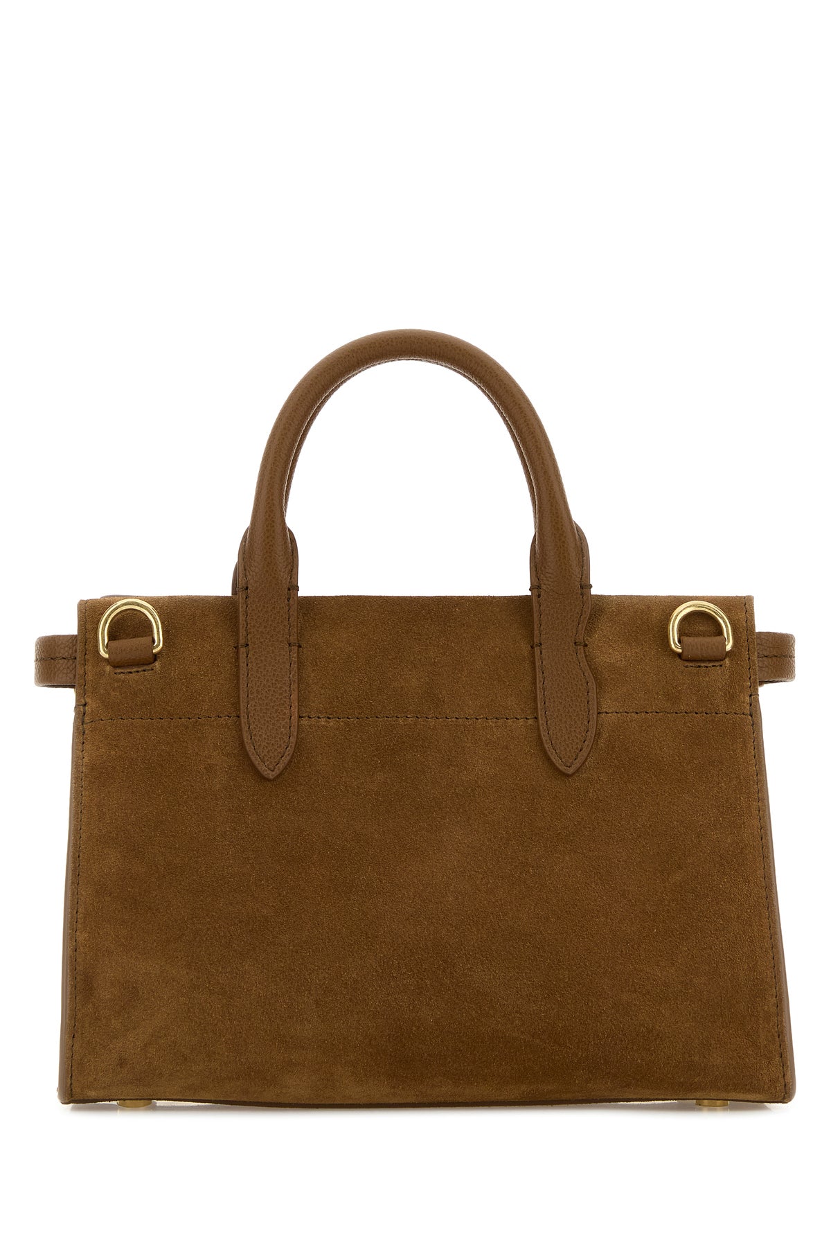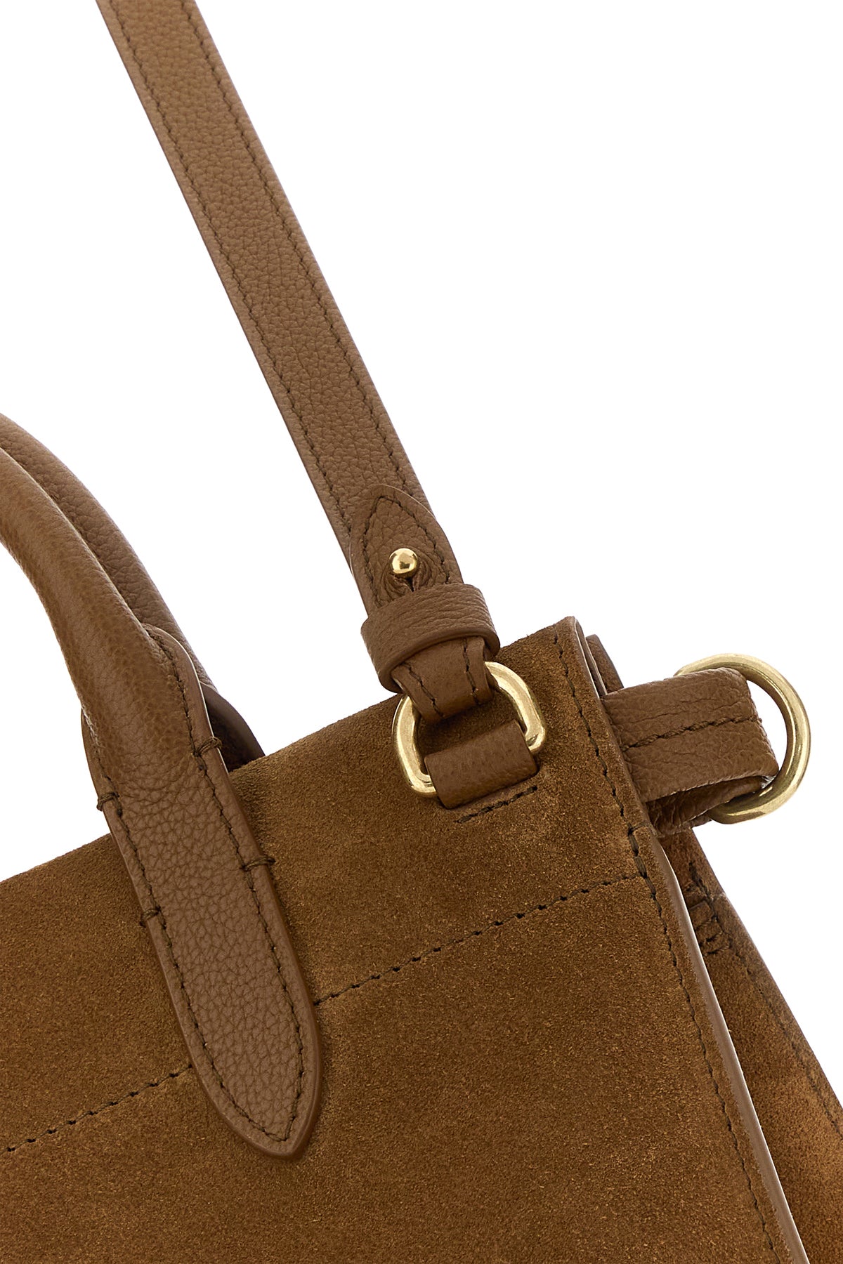 Handbag realized in calf suede characterized by laminated printed logo at the front.