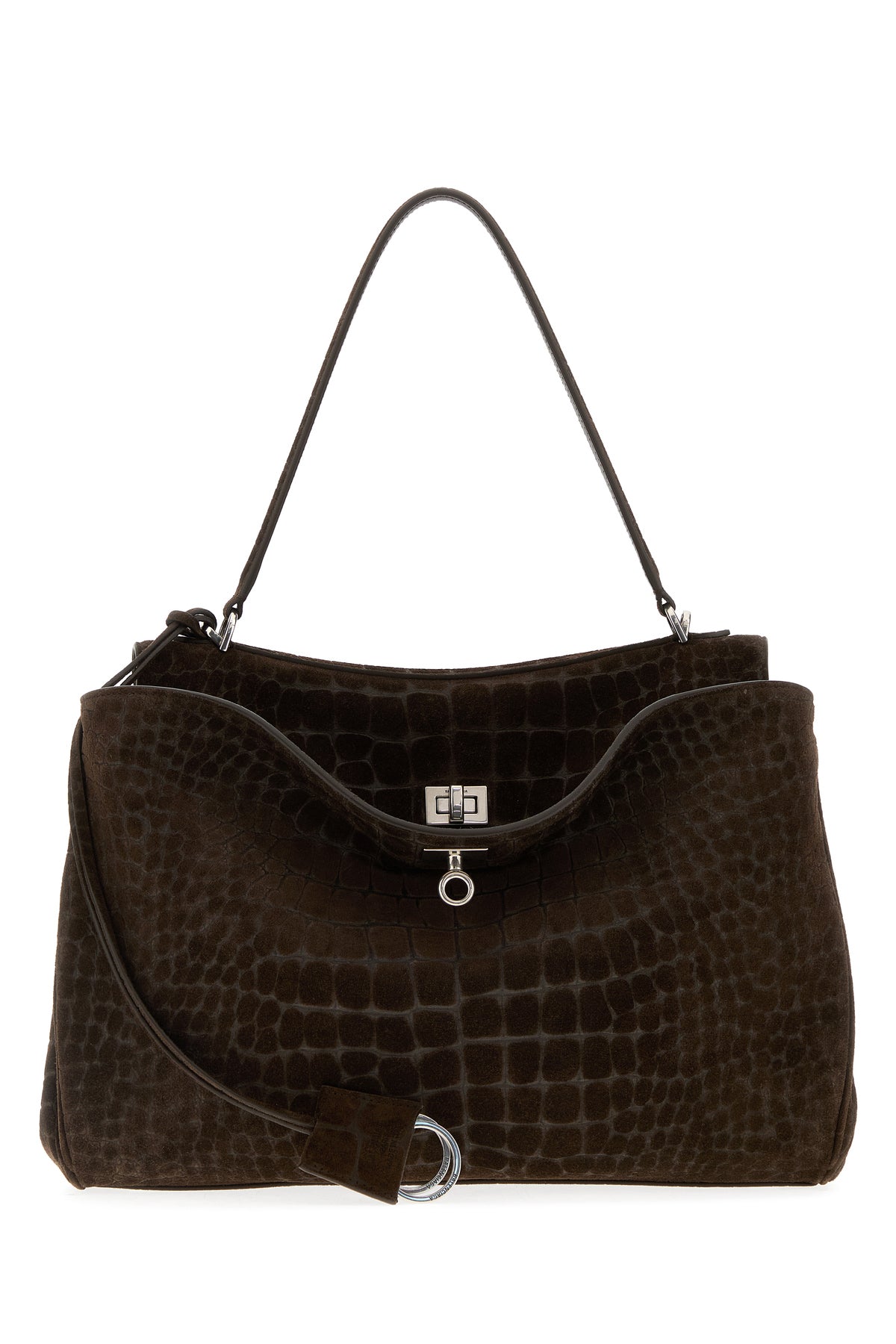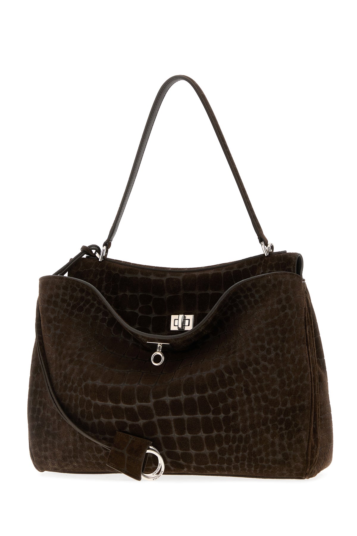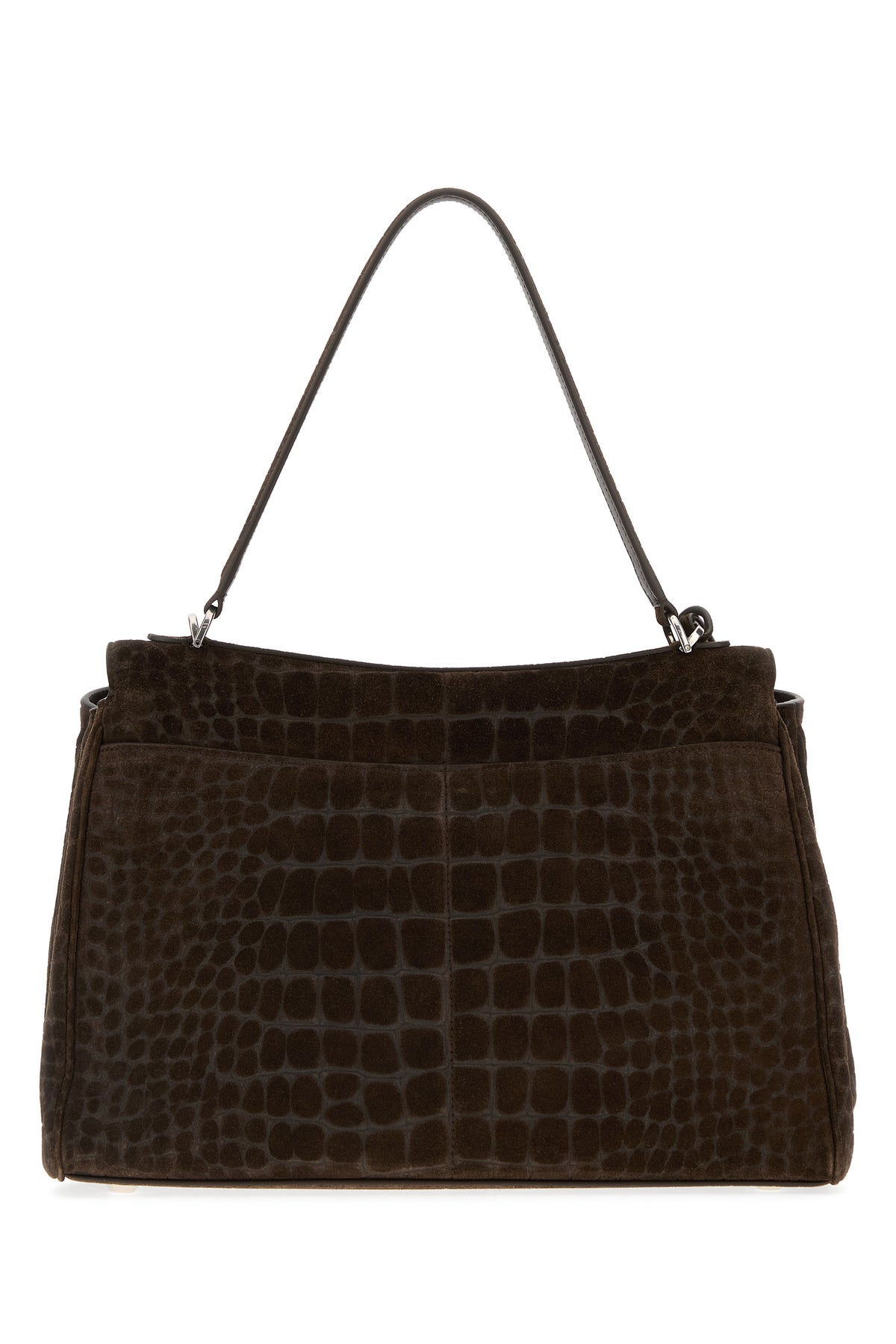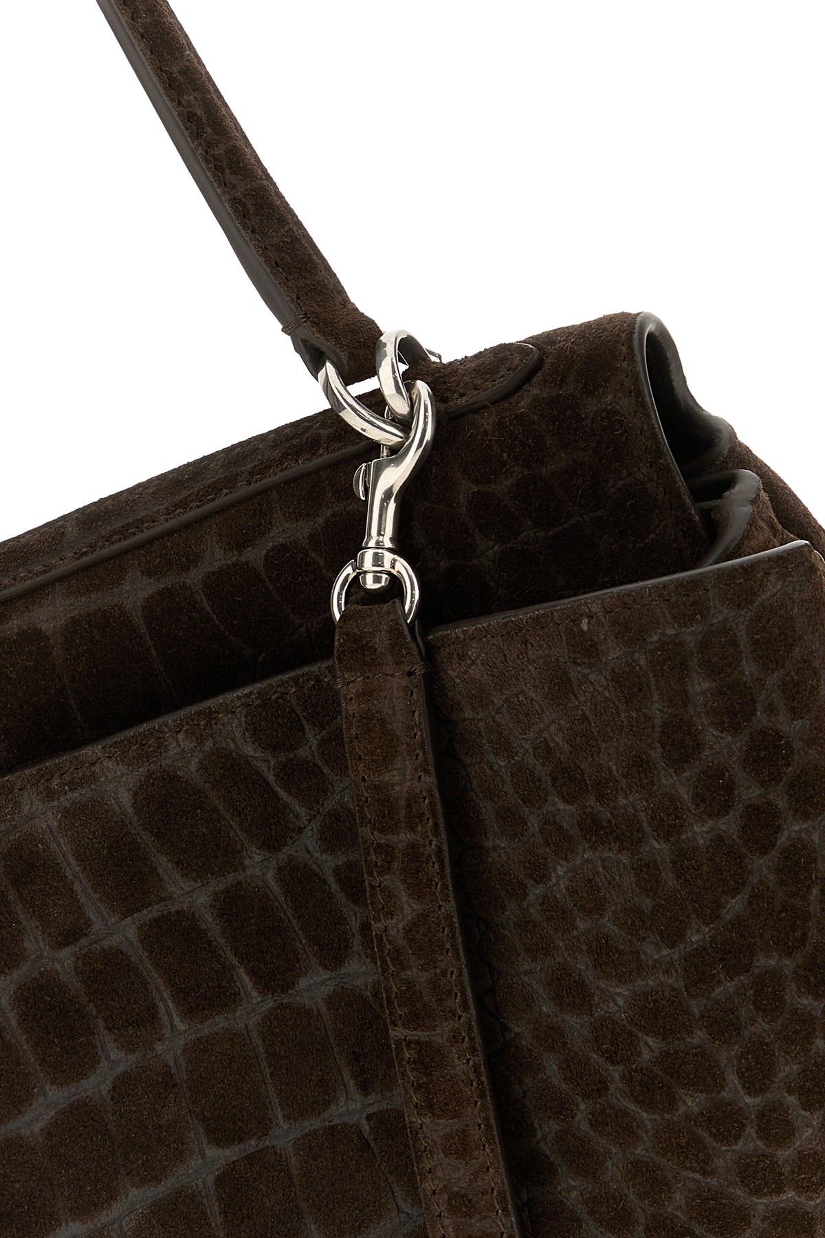 Handbag realized in crocodile embossed suede characterized by snap-fit closure.