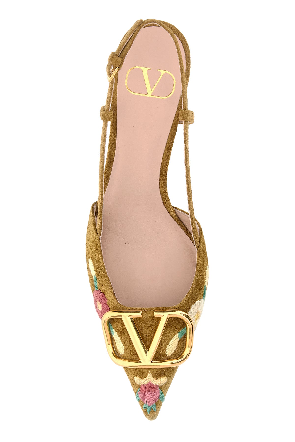 Slingback realized in suede characterized by floral embroideries on the entire surface enriched by VLogo Signature metal detail on the instep.