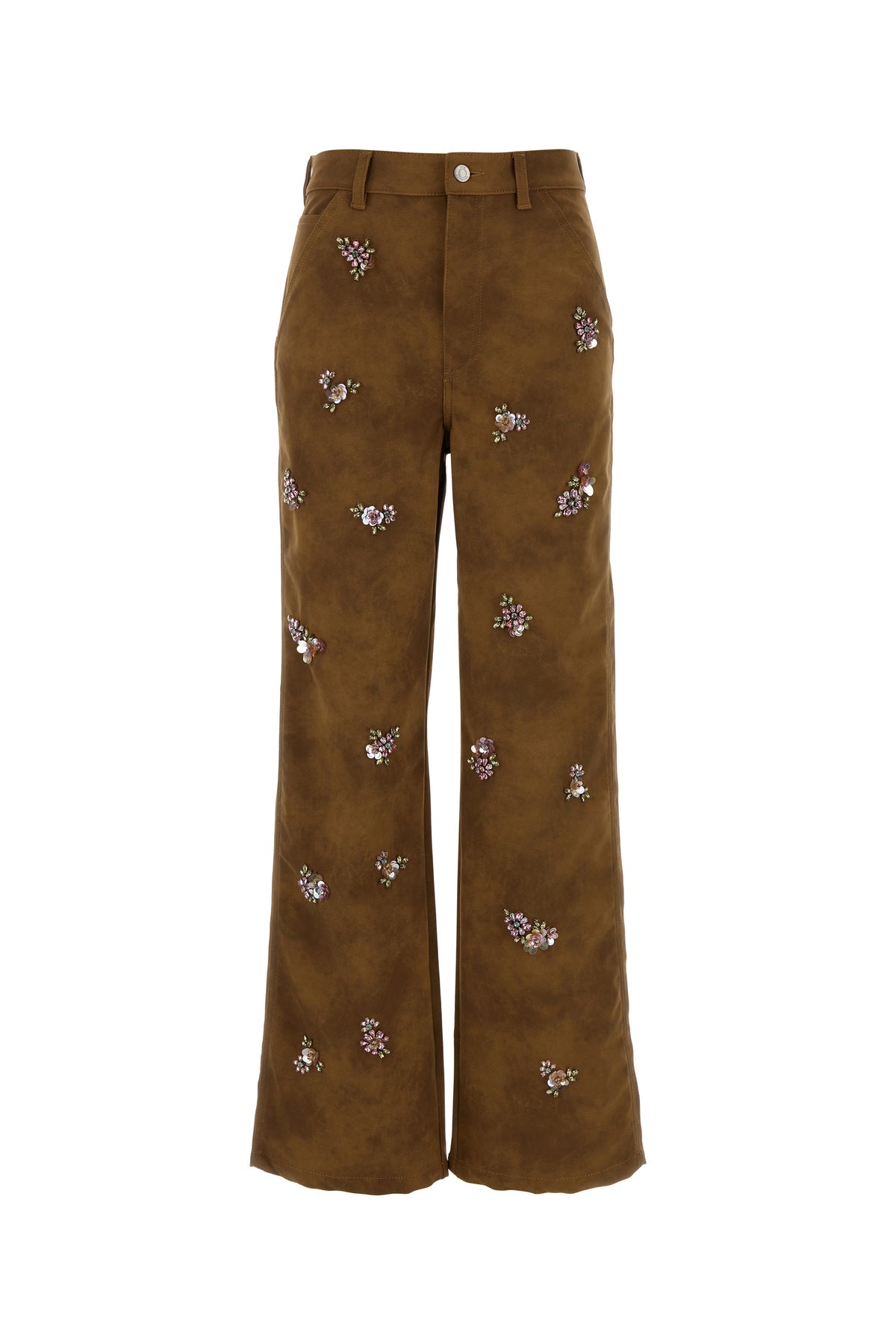 Pant realized in synthetic leather enriched by jewel embellishments at the front and logoed label at the back.