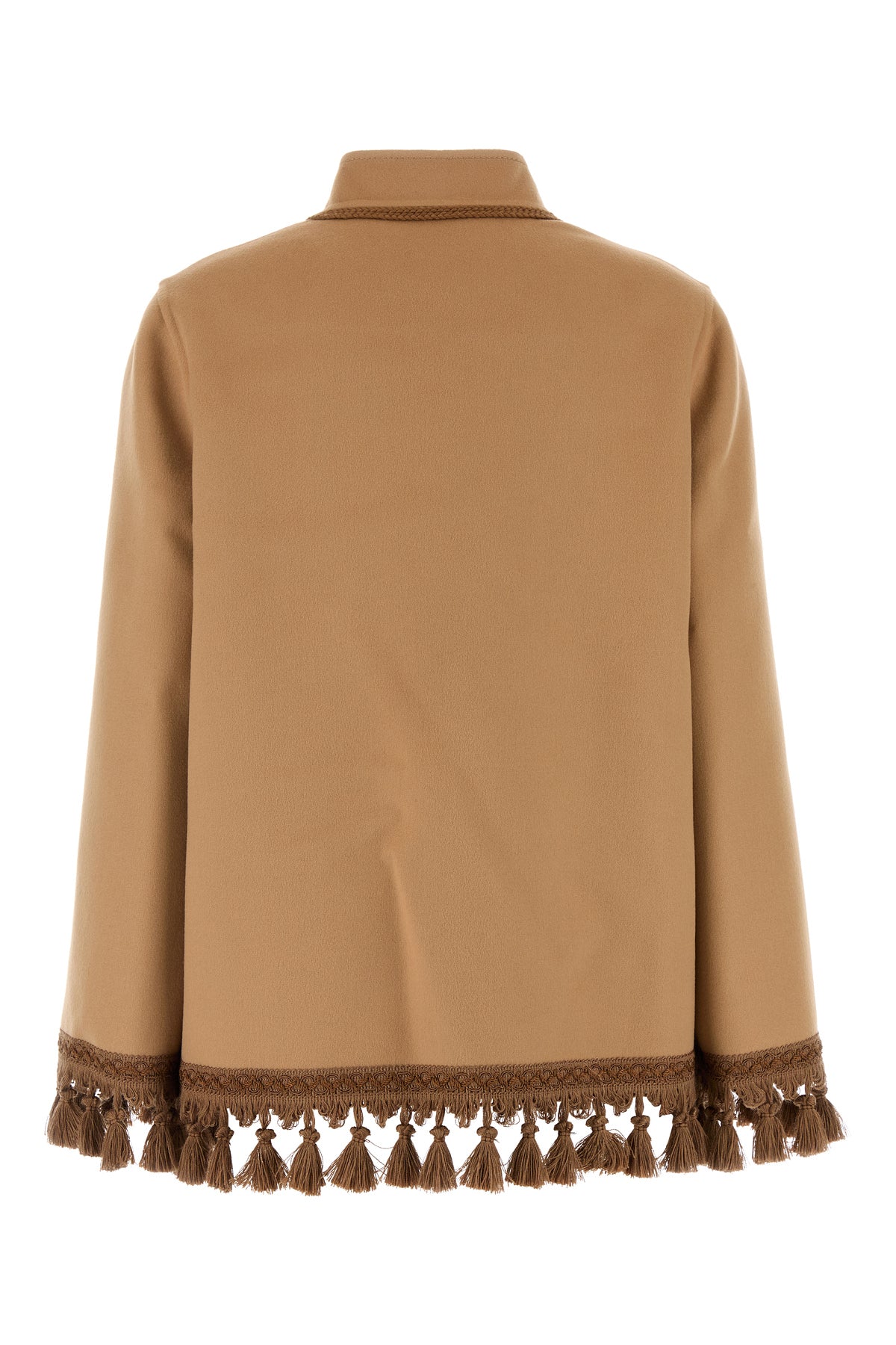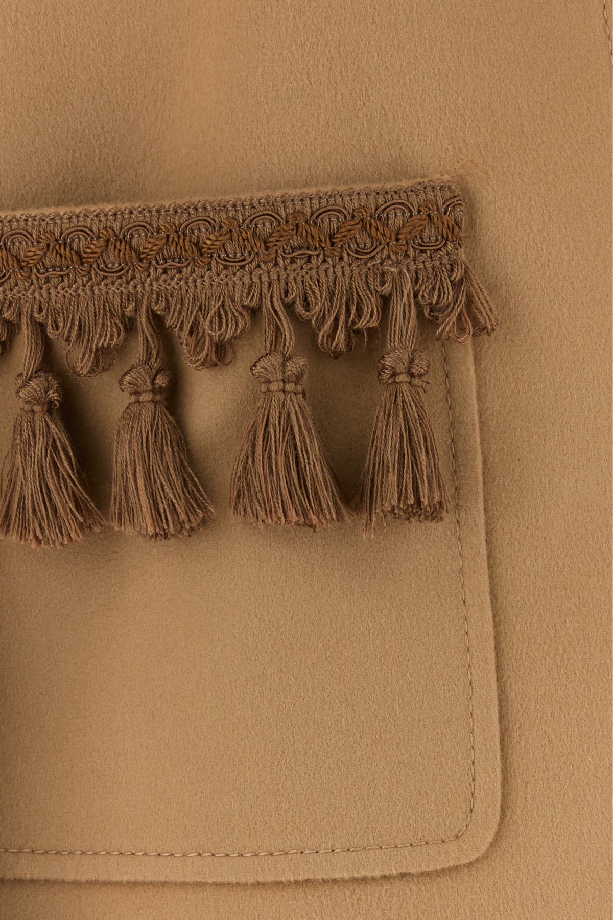 Short-cut coat realized in wool and cashmere enriched by decorative tassels on the patch pockets, on the cuffs and on the hemline.