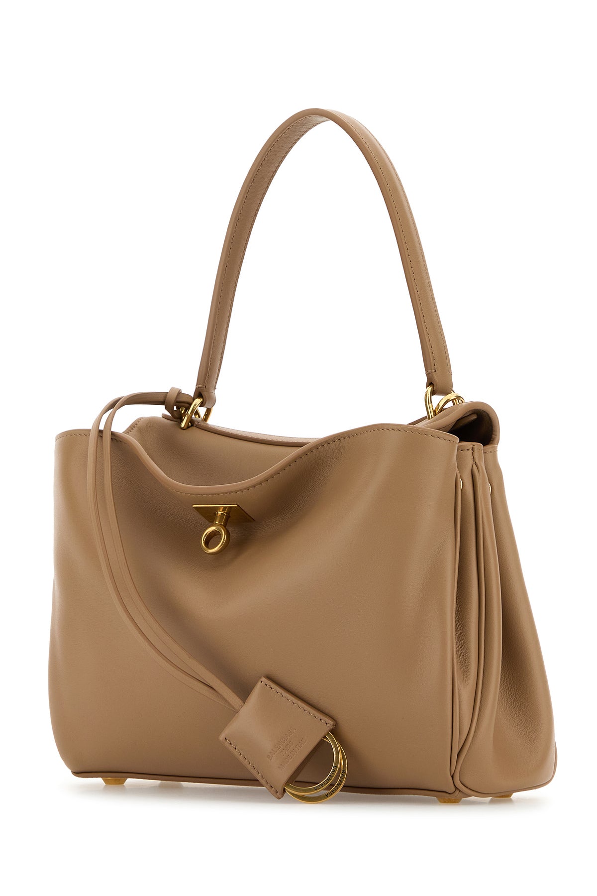 Handbag realized in smooth calf leather enriched by detachable tonal leather accessory with metal rings.