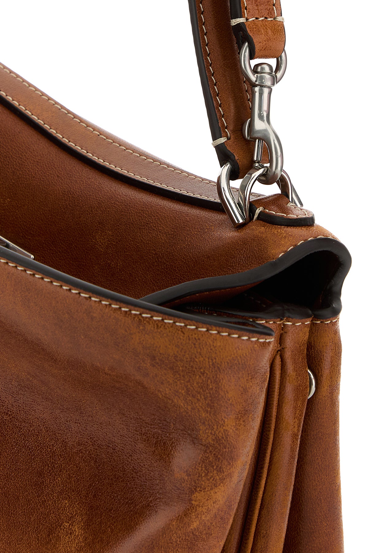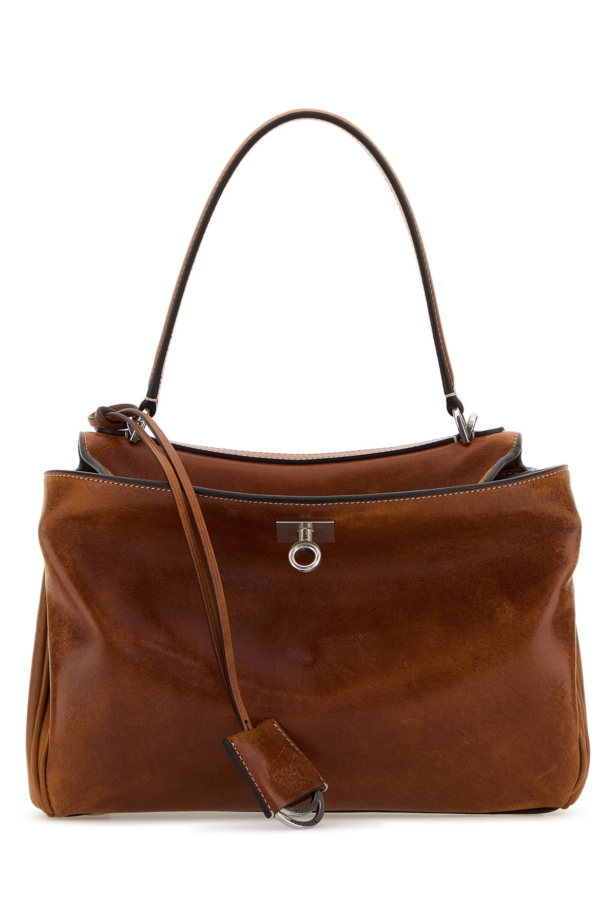 Handbag realized in smooth calf leather enriched by detachable tonal leather accessory with metal rings.