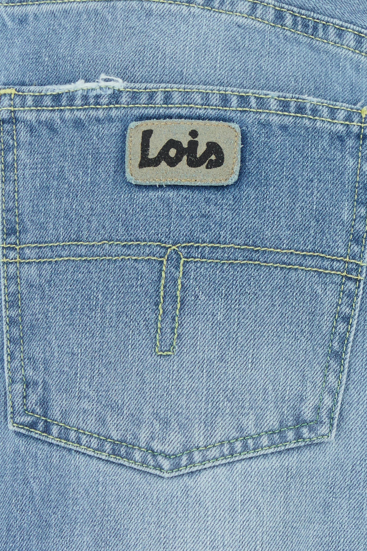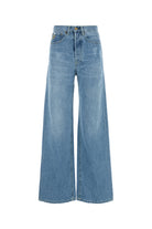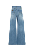 Wide-leg jeans realized in slightly stonewashed pure cotton denim enriched by contrasting logoed patches at the front and at the back.