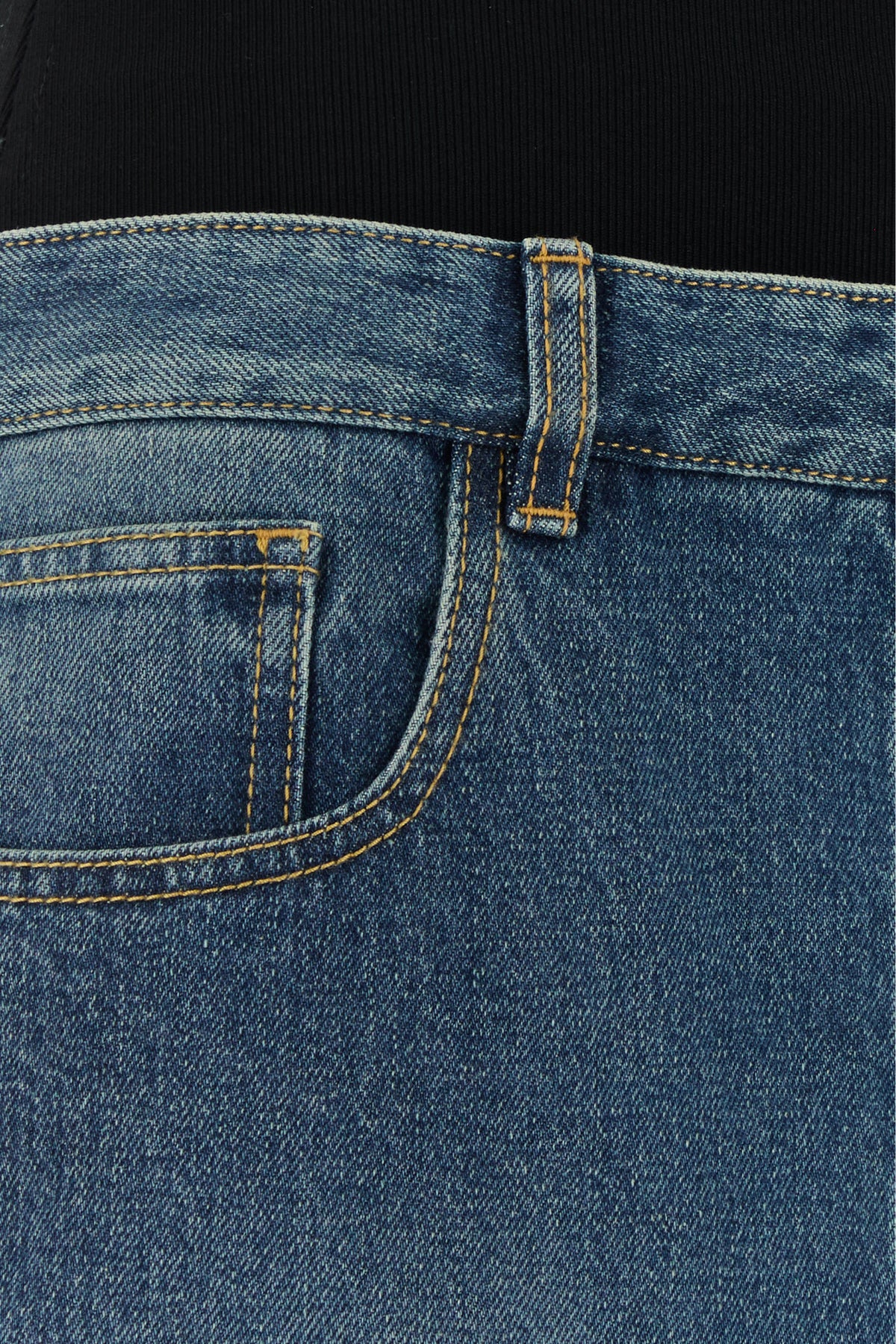 Skirt realized in stonewashed denim with contrasting fabric insert at the top.