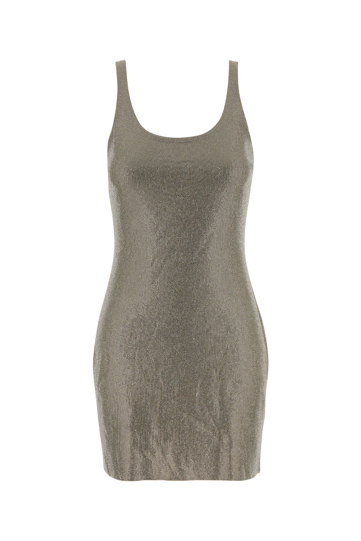 Fitted mini dress realized in jersey entirely covered by rhinestones.