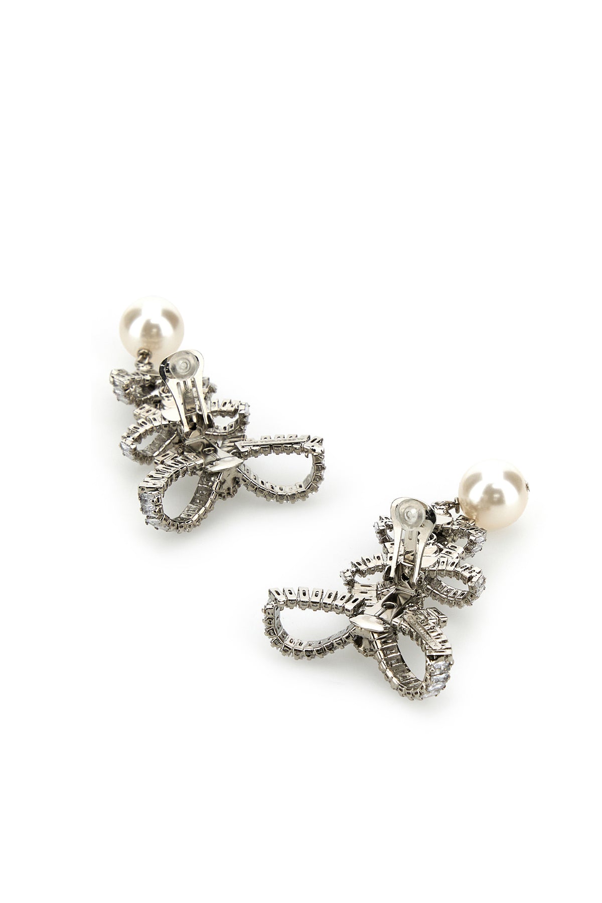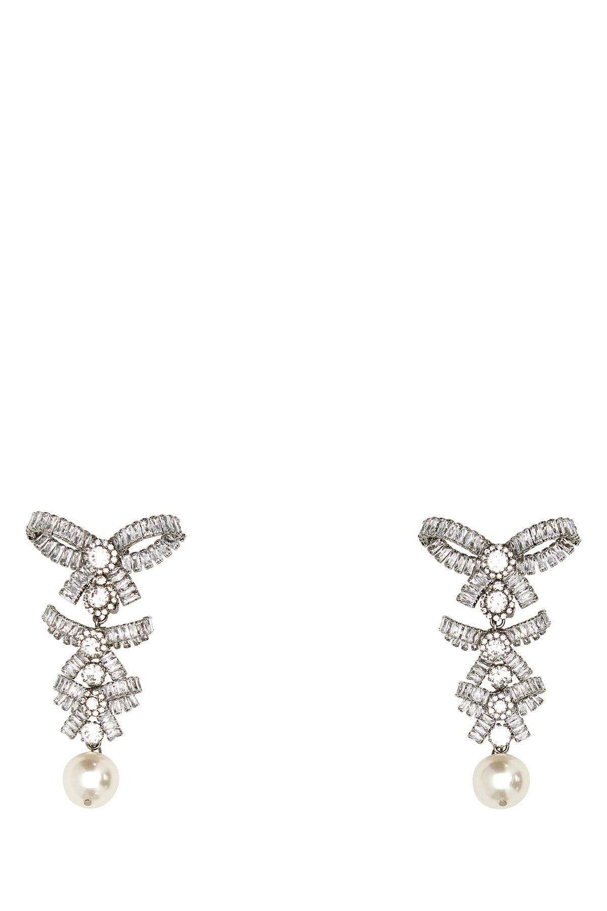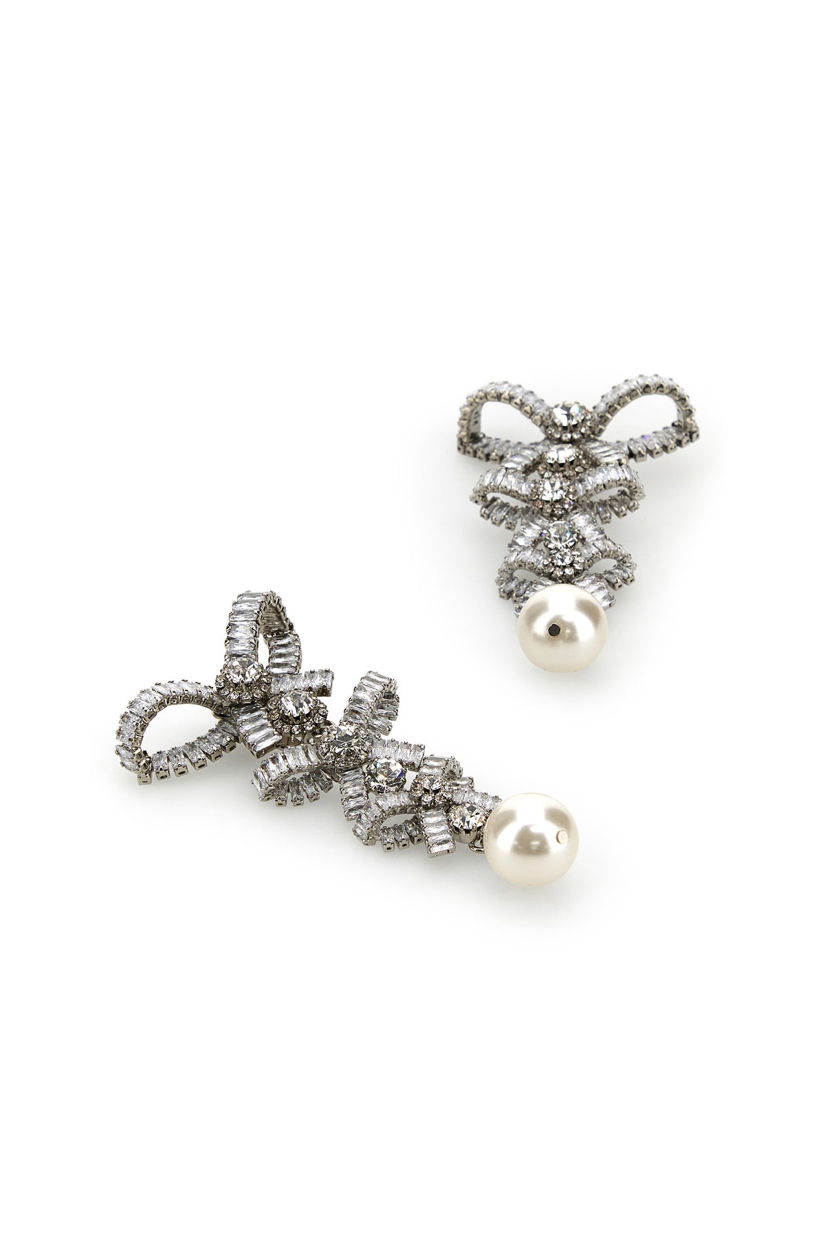 Pendant earrings realized in silver-tone plated metal enriched by rhinestones and pendant pearl.