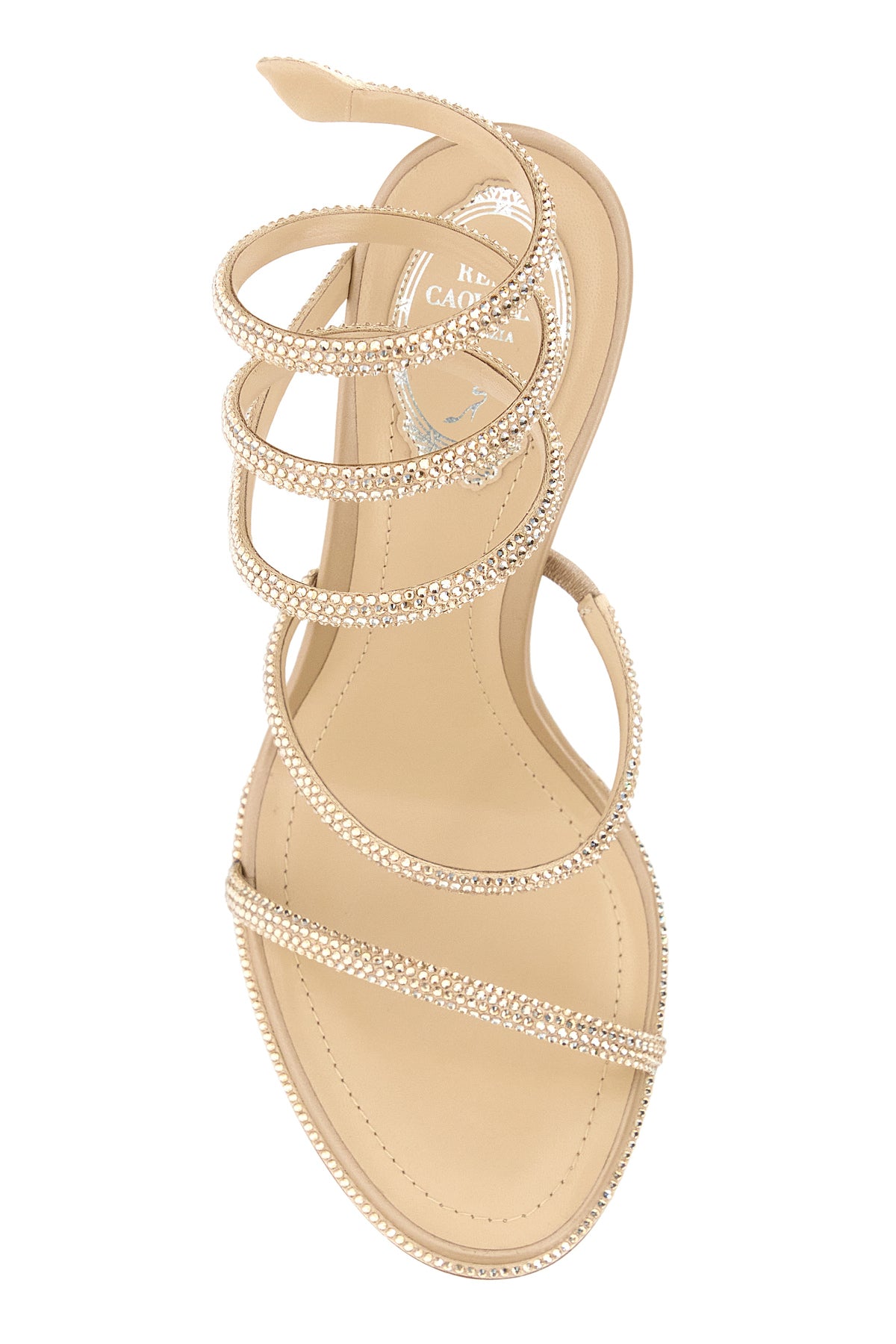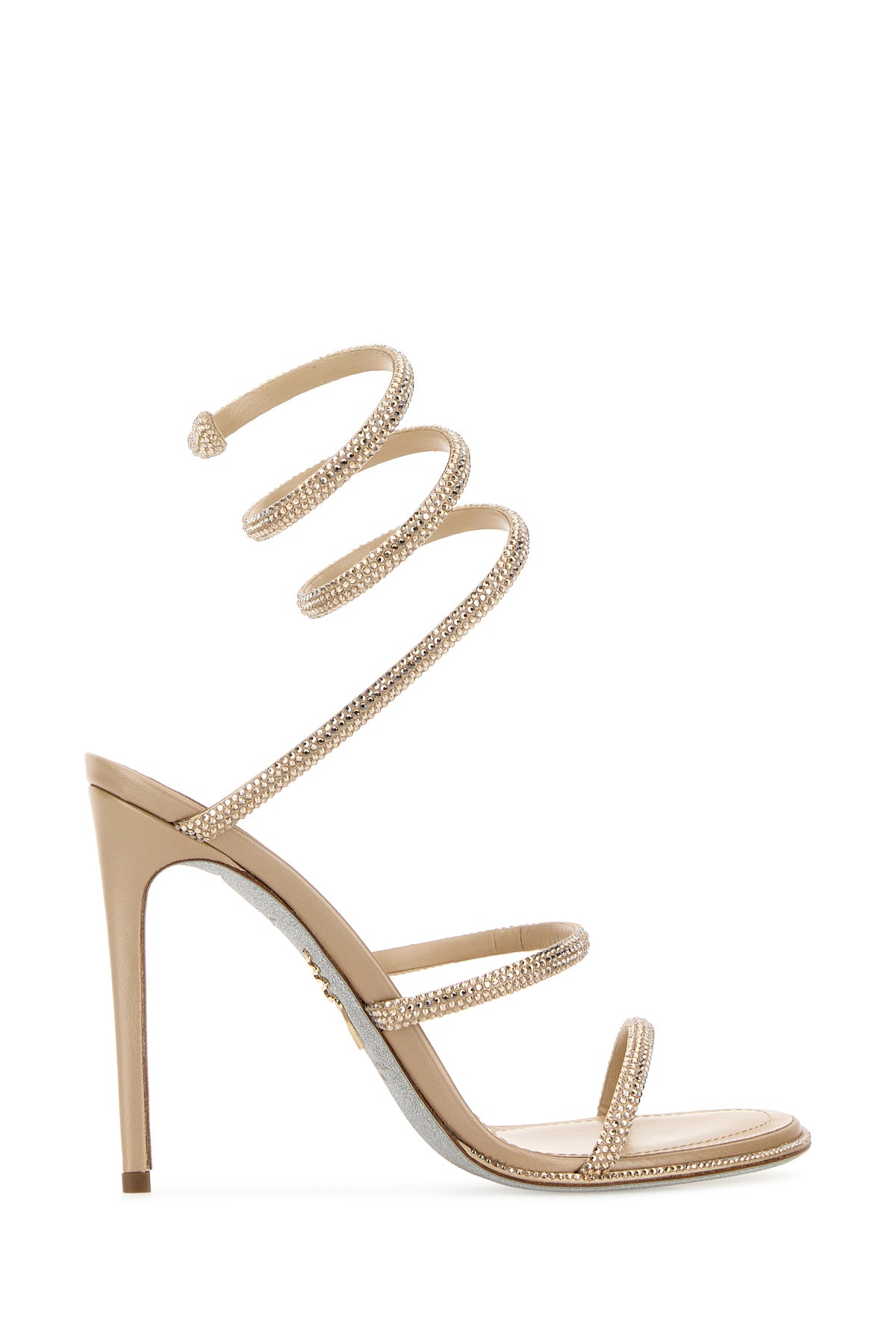 Sandals realized in satin entirely covered by rhinestones characterized by spiral at the ankle.