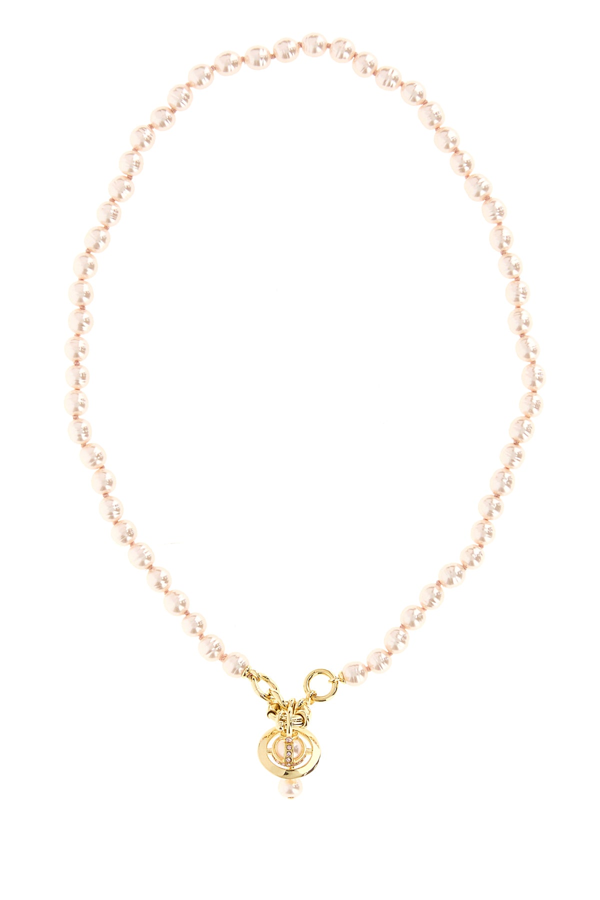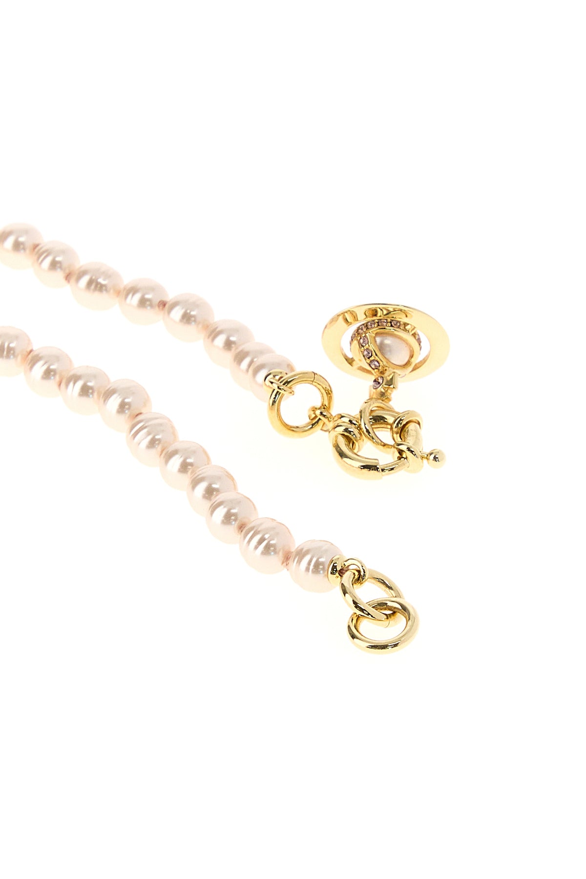 Necklace realized in pearls enriched by metal Orb charm with rhinestones.