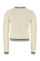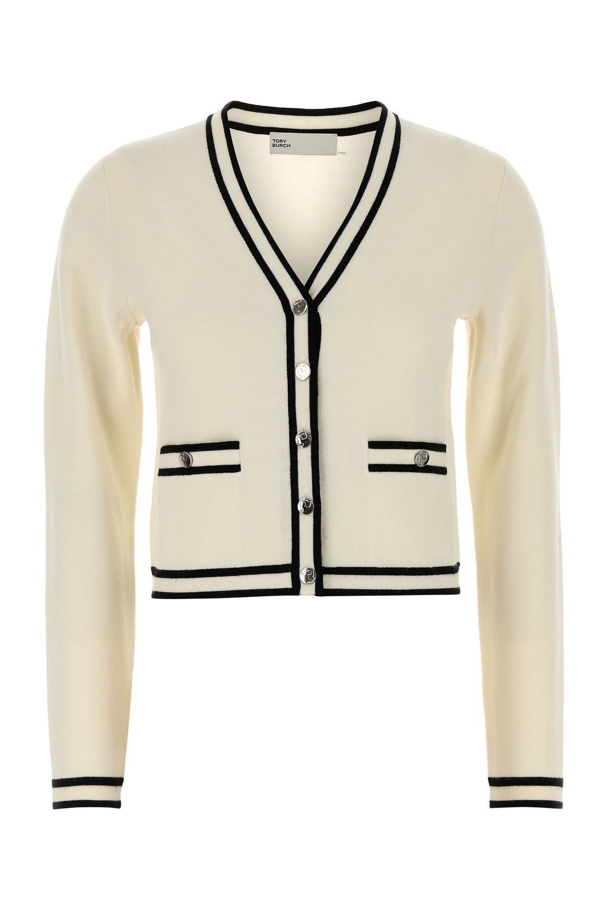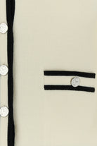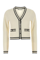 Cardigan realized in stretch wool blend characterized by contrasting trimmings.