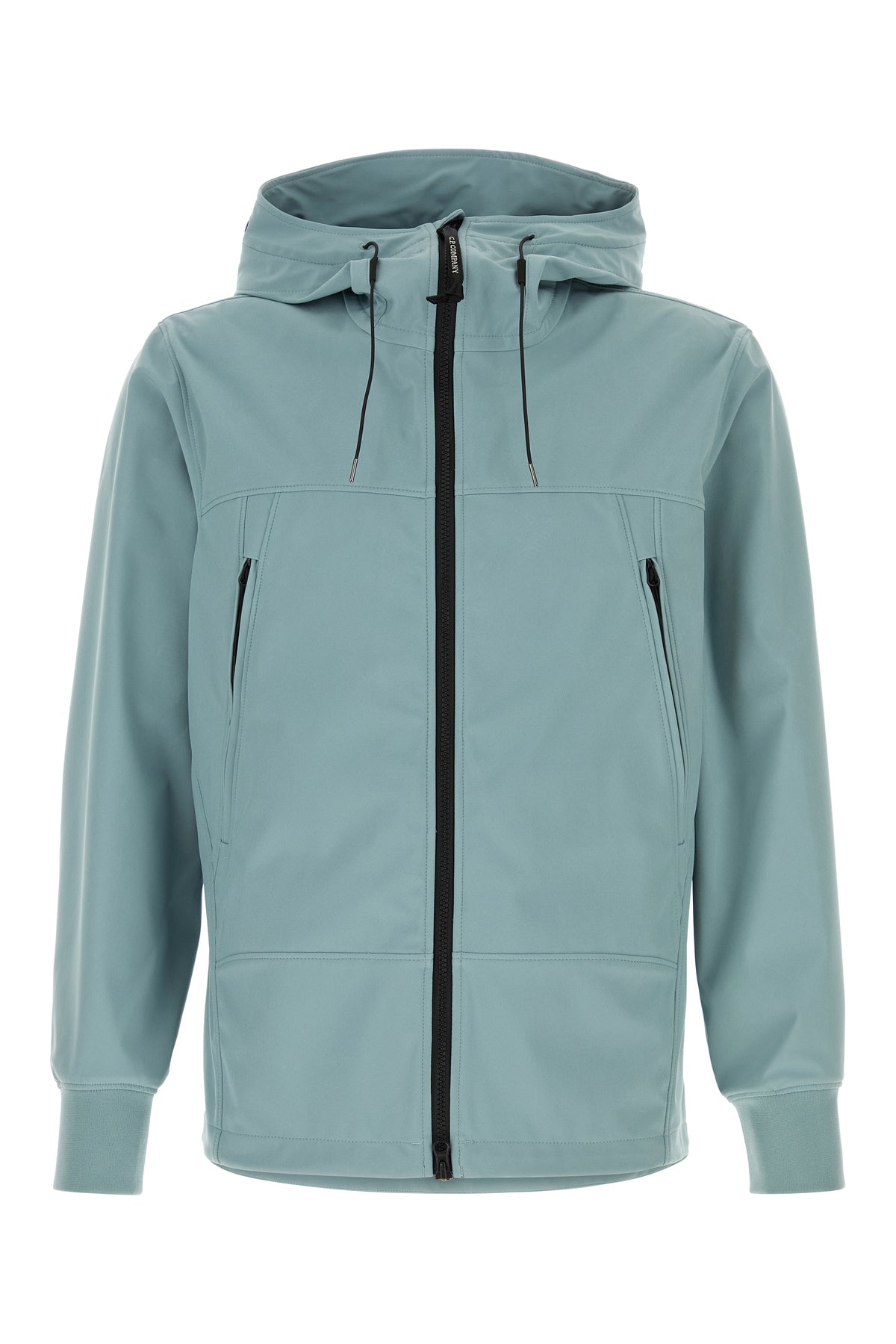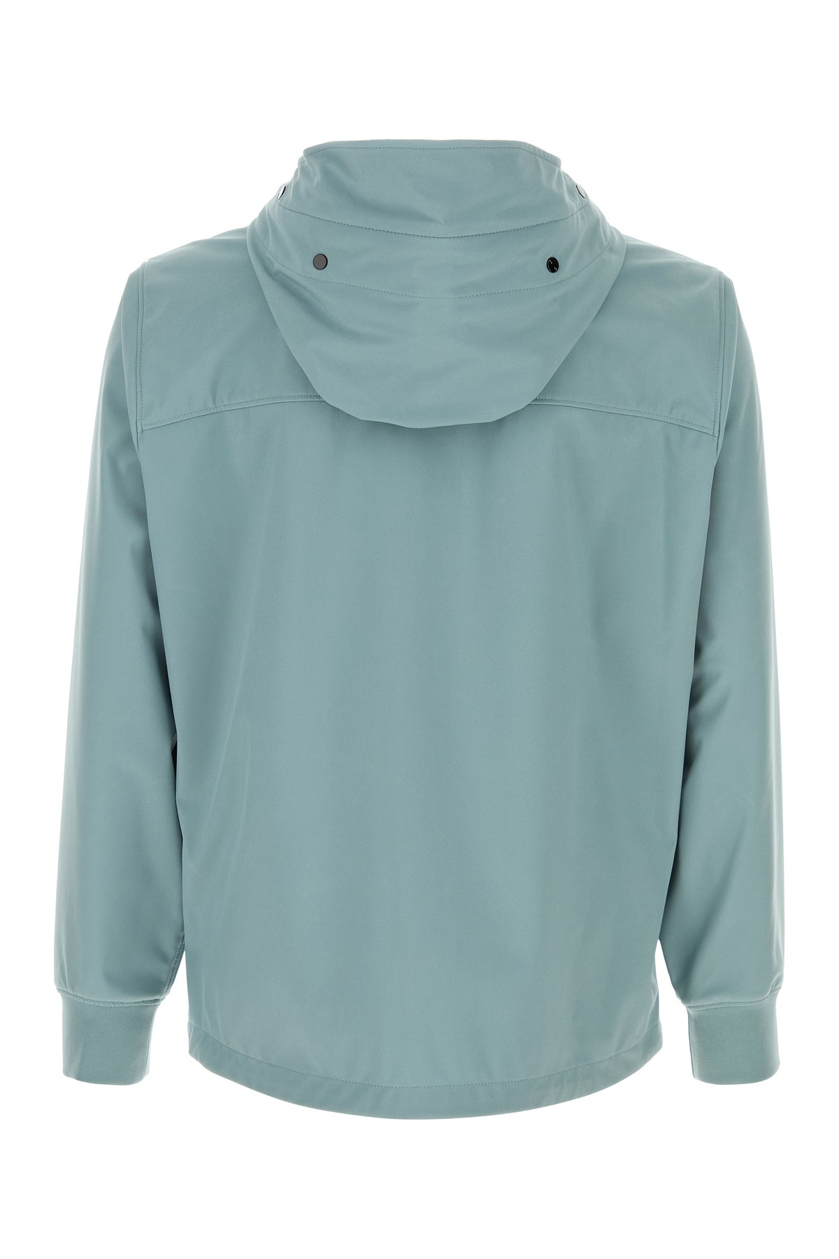 Jacket realized in stretch polyester characterized by drawstring hood.