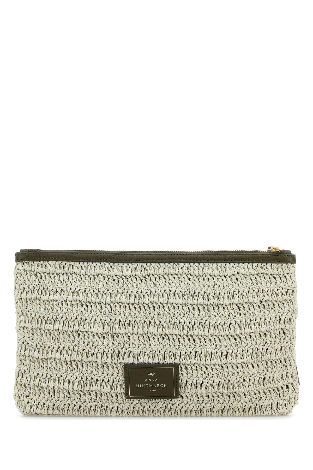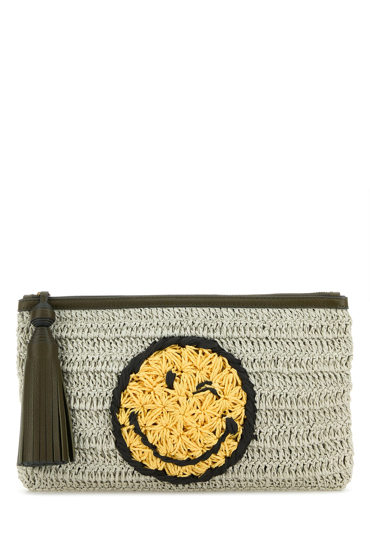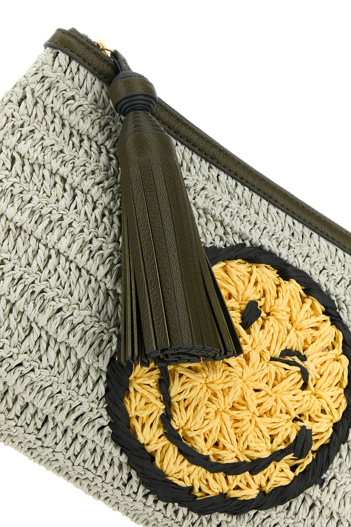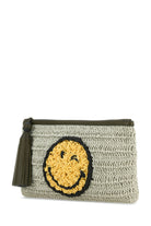 Pouch realized in woven raffia with leather inserts characterized by Wink embroidery at the front enriched by logoed patch at the back.