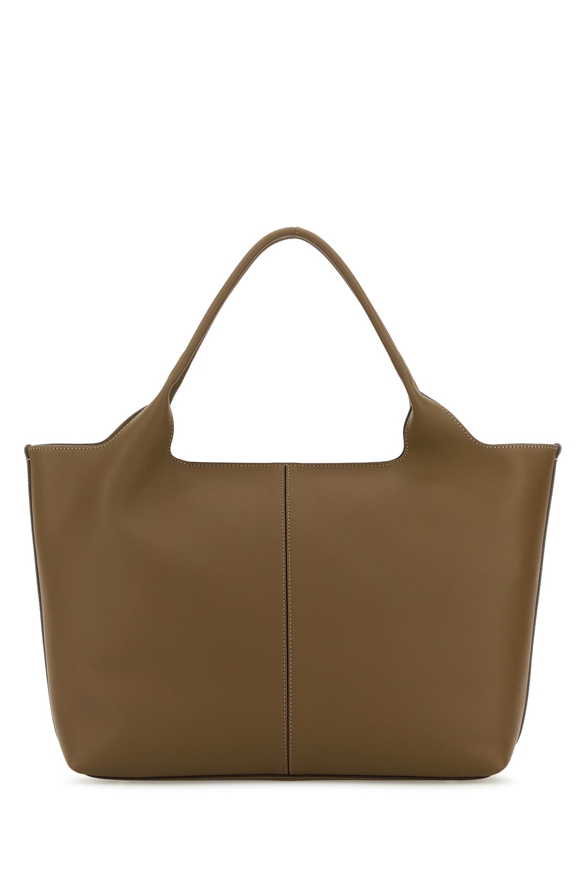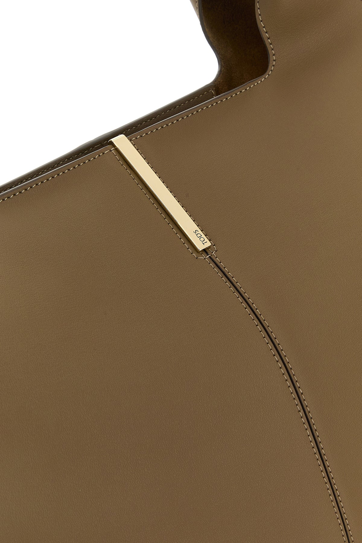 Shopping bag realized in pebble calf leather enriched by metal logoed patch at the front.