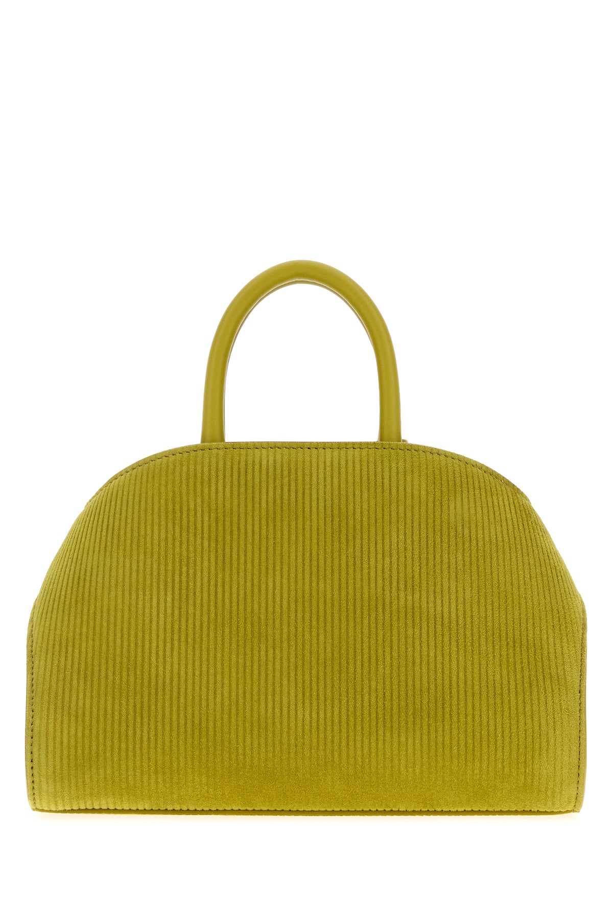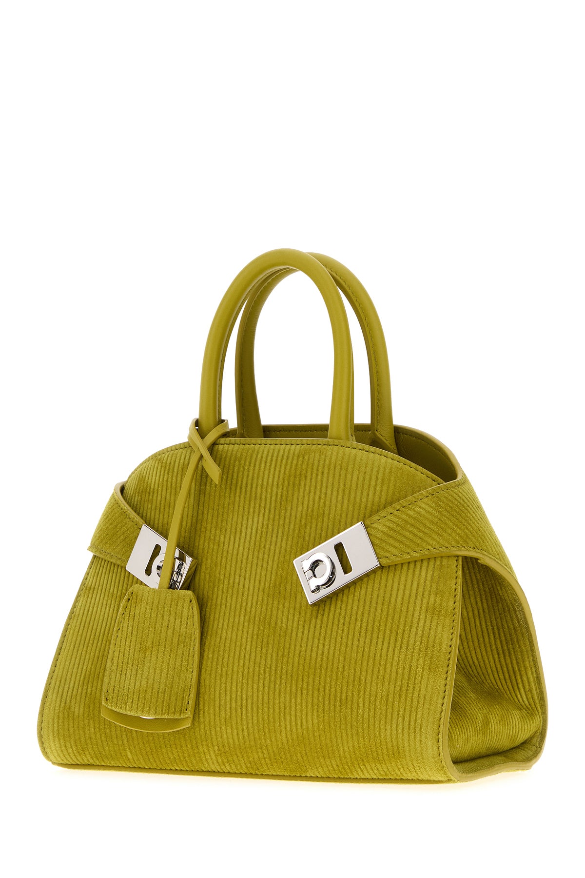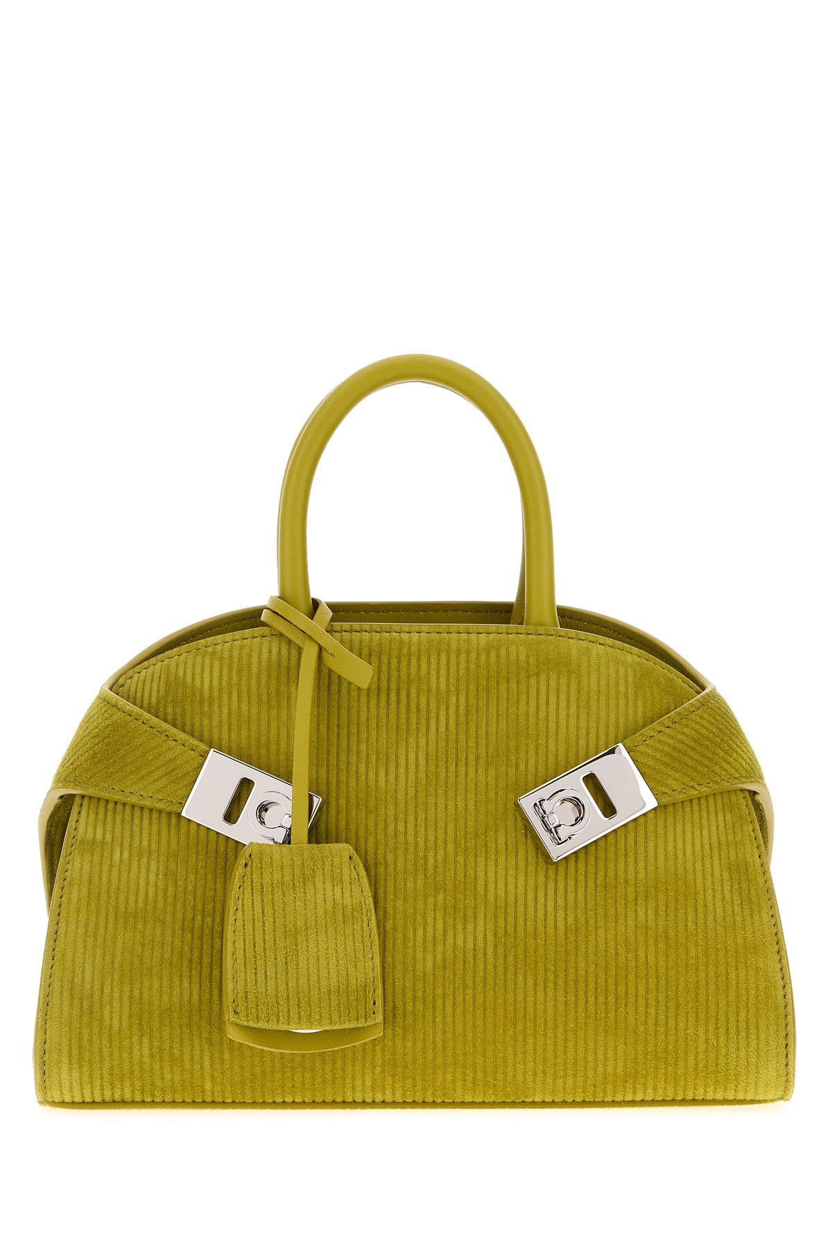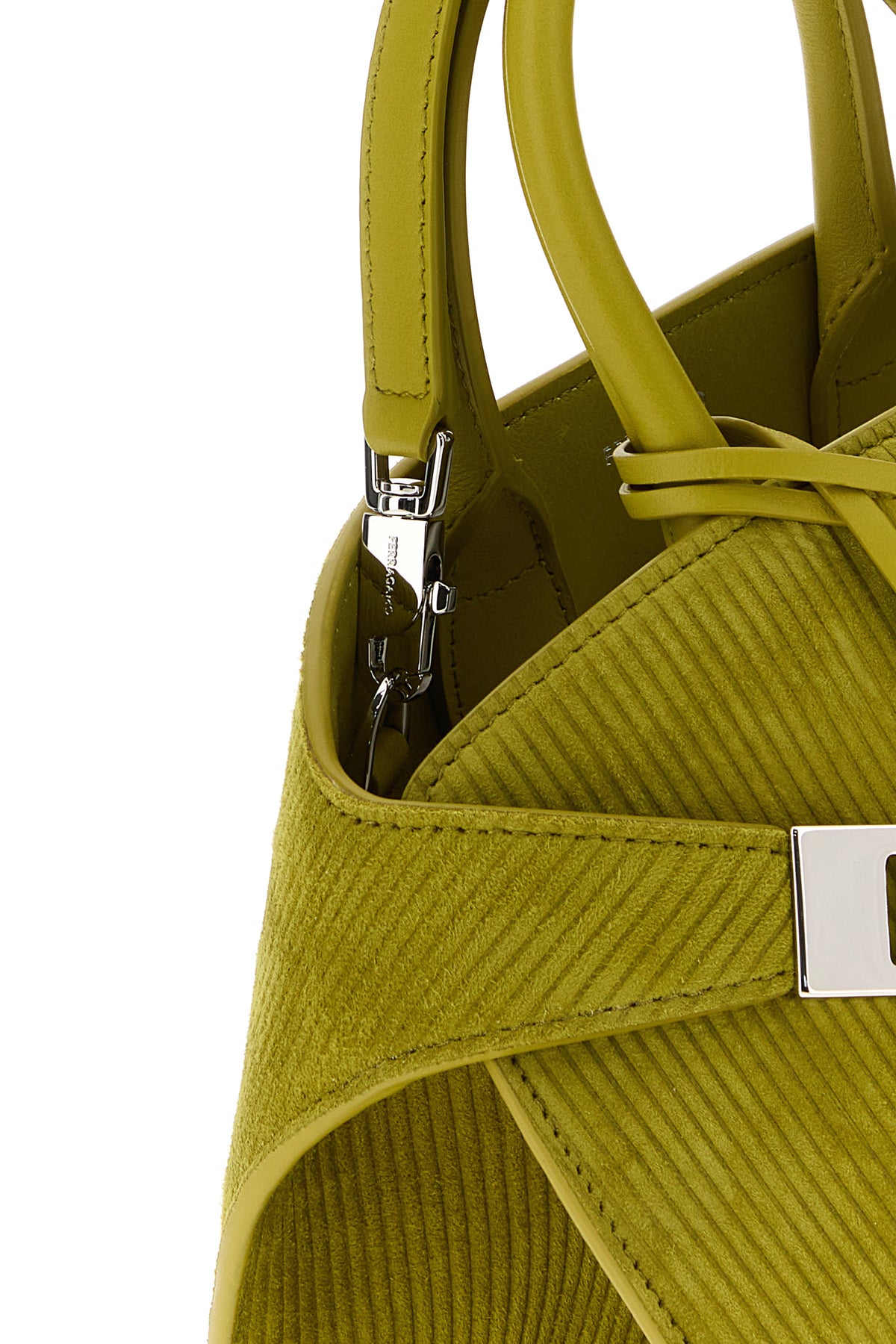 Handbag realized in calf suede enriched by leather straps with metal Gancini details at the front and detachable keyring accessory.